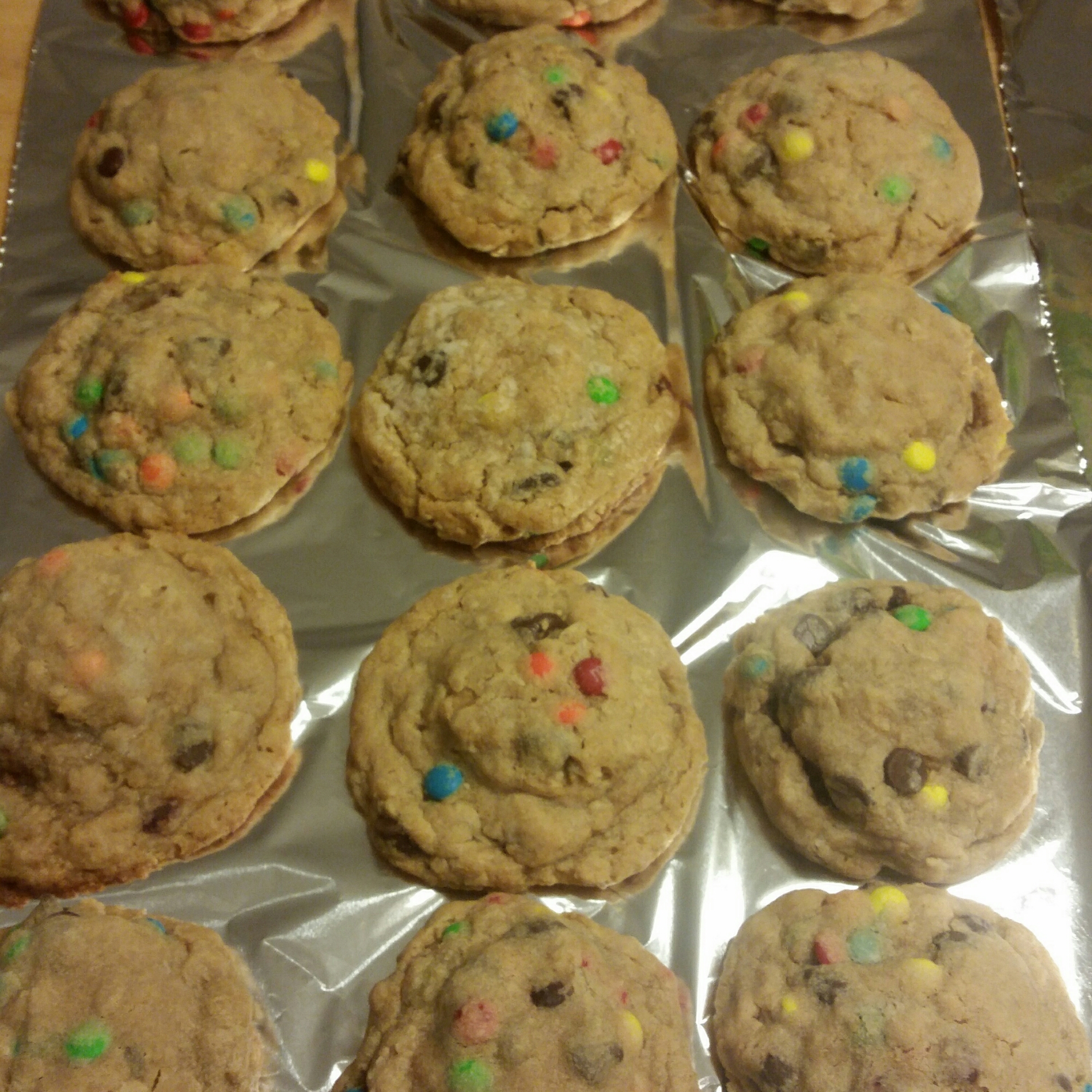 Combine cookie mixes, oats, butter and eggs. stir in chips and m&ms. form 2 -3 tbs dough around each peanut butter cup. chill dough for at least a few hours or up to a couple of days. bake in oven preheated to 375 degrees. bake for 12 to 14 minutes. I like to take mine out a little early bc they cook a little on the pan as they cool. store in a covered container. the next day or so, you can also microwave a cookie for 10 seconds and they taste like they came.right out of the oven!