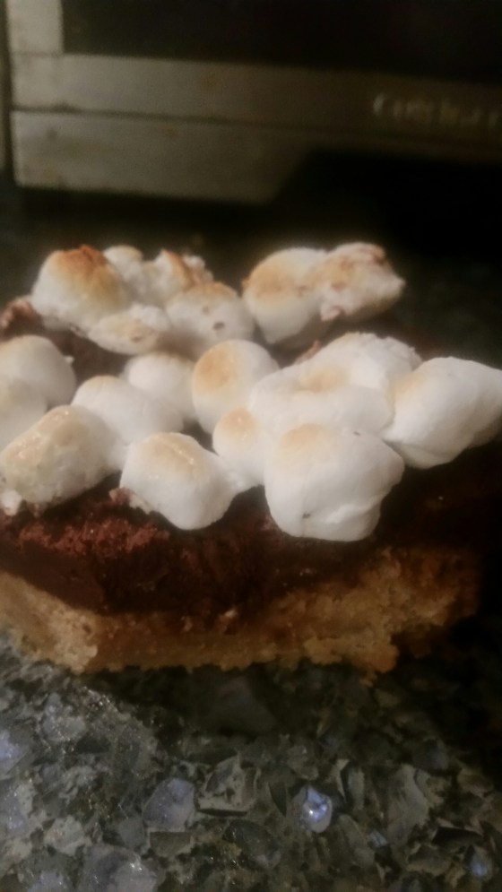 These are from Betty Crocker. They have a sugar cookie/graham cracker crust with a layer of fudge and toasted marshmallows on top.