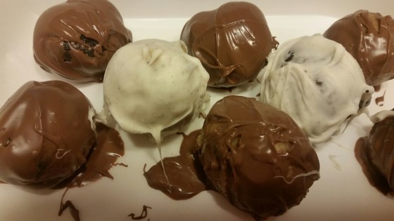 Dip truffles in. Place on parchment paper and keep refrigerated 30 minutes until you are ready to serve. Store in fridge.