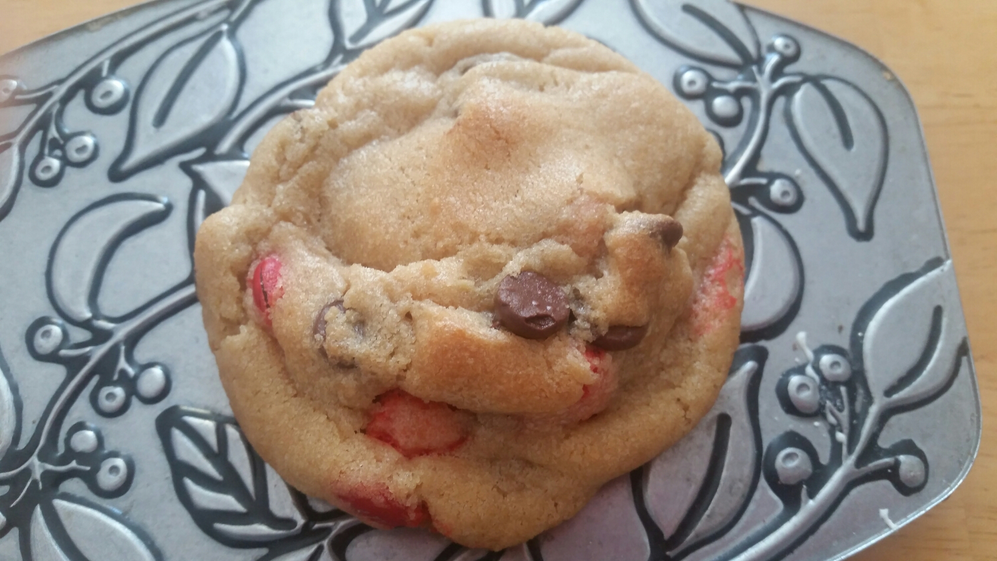 1 cup of butter, 1/2 cup sugar, 1 cup brown sugar, 1 egg, yolk, 3 tsp vanilla, 2 1/2 to 3 cups flour, 2 tsp cornstarch, 1 tsp baking soda, 1/2 tsp salt, 3 tbs cream or milk, 1 cup red m&m’s, 1 cup chocolate chips.(or you can use white chips or milk chocolate chips).