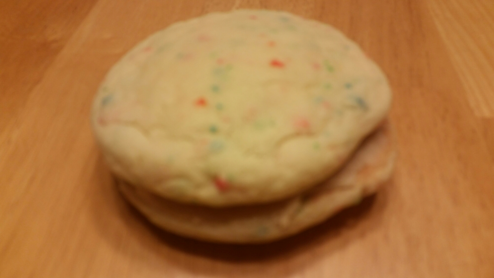 I love the rainbow chip/funfetti cake mixes… so bright and cheery. Instead of making a cake to bring to work, I opted to make cookie sandwiches and I used a brown sugar frosting as the filling.