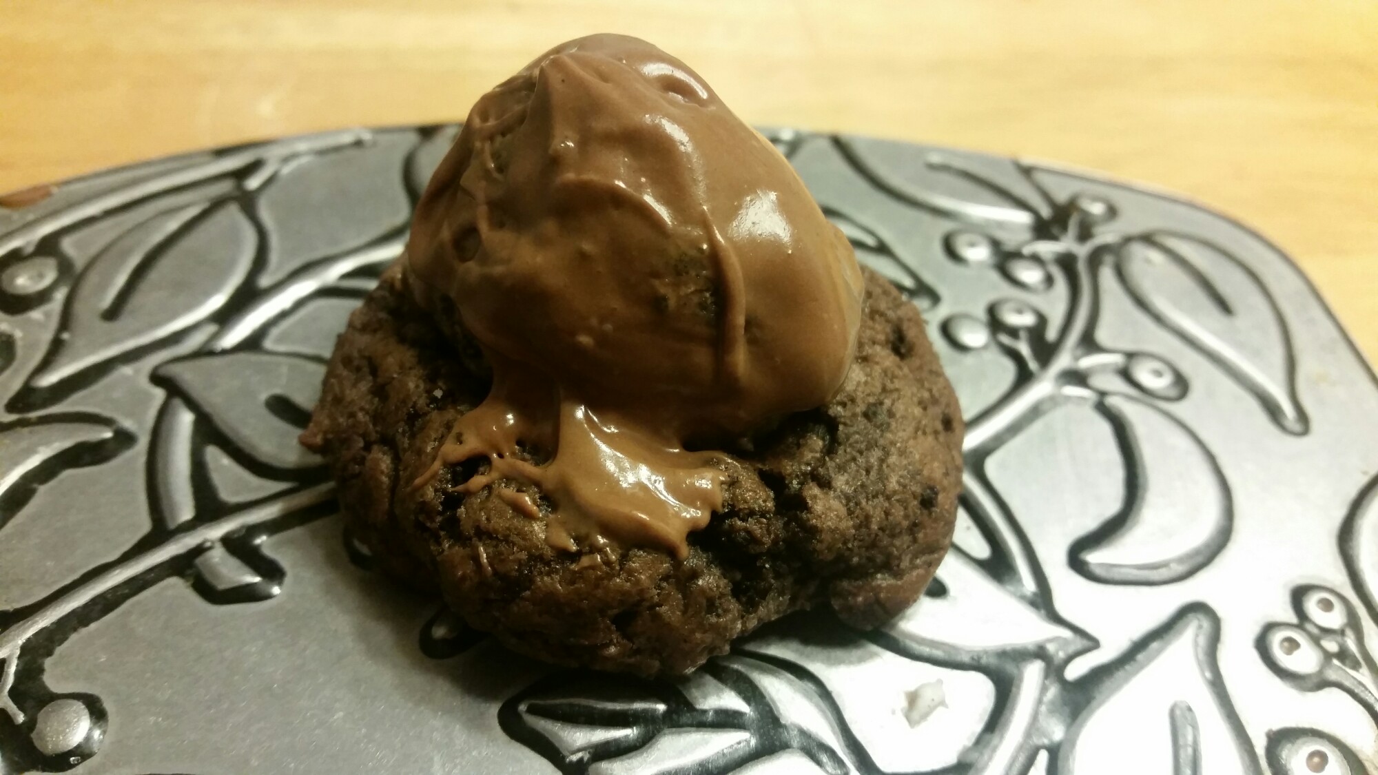 Directions – preheat oven to 350. Combine brownie mix, egg, cream cheese, butter and 1 cup finely ground oreos. Roll 1 tbs of dough into balls. Place on cookie sheet, lined with nonstick baking liners. Bake for 11 minutes. Remove from oven. Immediately place a ball of filling on top of each cookie. Let cool completely. Top with melted Reese’s peanut butter cups or milk chocolate. (I microwaved reese’s in 45 second increments until incould stir them smooth) . Store in covered container.