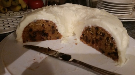 Preheat oven to 350. Mix eggs, sugar, oil and flour. Add cinnamon, salt, baking sof a and baby food carrots. Fold in chips. Pour batter into a pan that has been sprayed with baking spray. For a bundt pan, bake 40 to 50 minutes. Two 8 or 9 inch round cake pans, bake 20 to 30 minutes. For a 9×13 rectangular pan, bake 20 to 30 minutes. Your cake is done when a toothpick inserted comes put basically with just a few crumbs. Let cool completely.