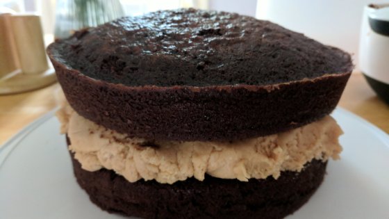 Place second cake layer, flat side on top of peanut butter layer, and gently press down, like this.