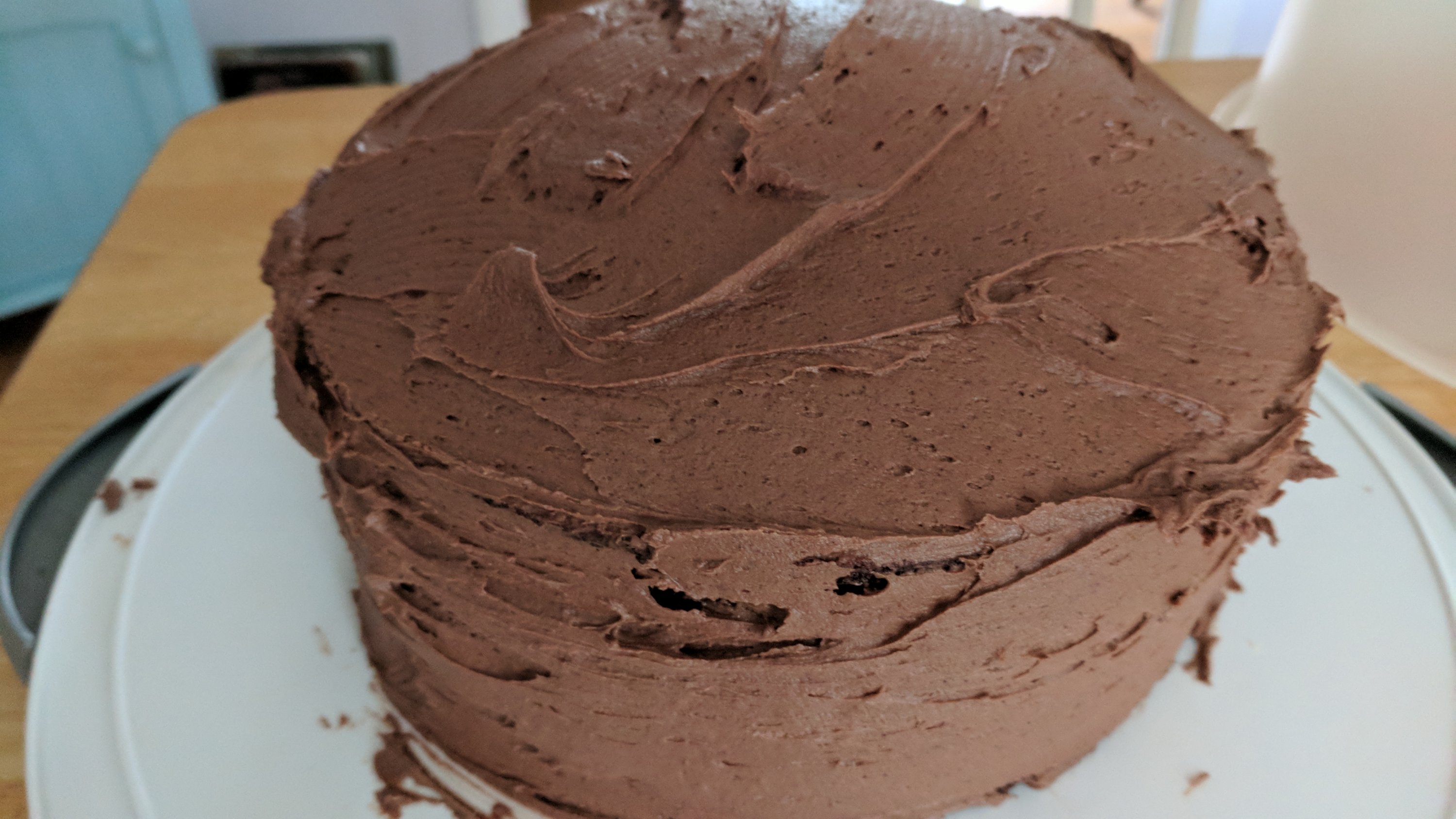 Directions – preheat oven to 350. combine milk and lemon juice or vinegar and set aside 10 minutes to make buttermilk. Stir together cocoa and boiling water. In a separate bowl, cream shortening, sugar and vanilla. Add eggs. Stir in dry ingredients, then cocoa mixture. Blend in buttermilk. Divide batter evenly into two round cake pans sprayed with Pam. Bake 25 to 30 minutes (until toothpick inserted in center comes out basically clean). Cool completely.