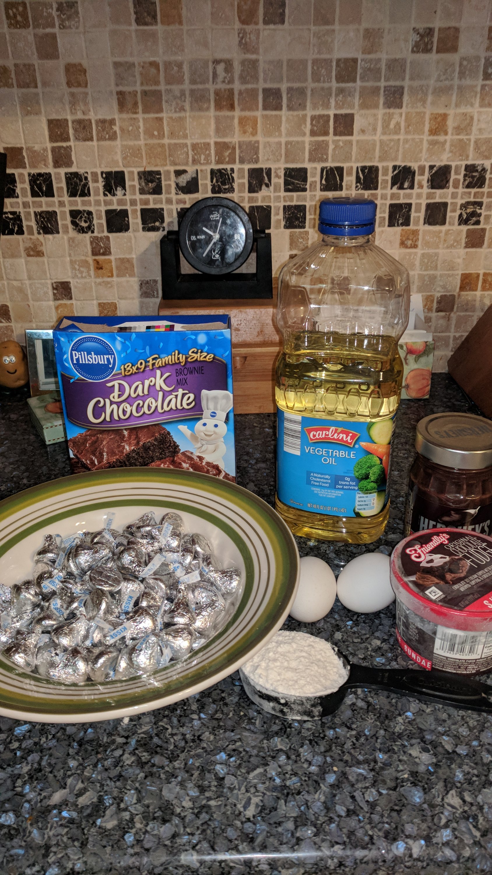 We have a LOT of Halloween candy (over 200 bars) and a TON of brownie and cake mixes be(all the baking stuff is on sale everywhere now through january. Woo hoo!). So I dipped into our stash to make stuffed Brownie cookies. I added two unique ingredients as well to the brownie batter – hot fudge topping and ice cream. I bought the single serve cups from Friendly’s to use.