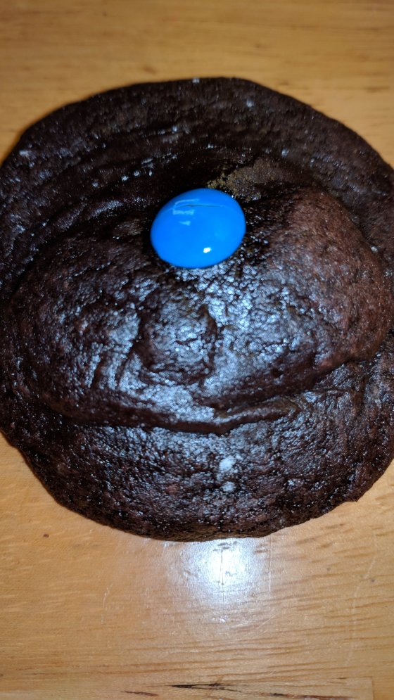 Directions – combine brownie mix, oil, flour and eggs. Blend in ice cream and hot fudge. Take 3 tbs of dough and form around each piece of candy or Oreo. Chill for an hour or so. Preheat oven to 375. Stagger 8 cookies on a cookie sheet lined with a non stick baking liner, like this.
