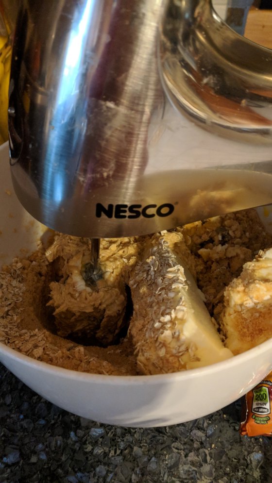 Directions – preheat oven to 375. Line cookie sheets with nonstick baking liners. Combine cookie mixes, oats, eggs and butter (I needed to use a mixer).