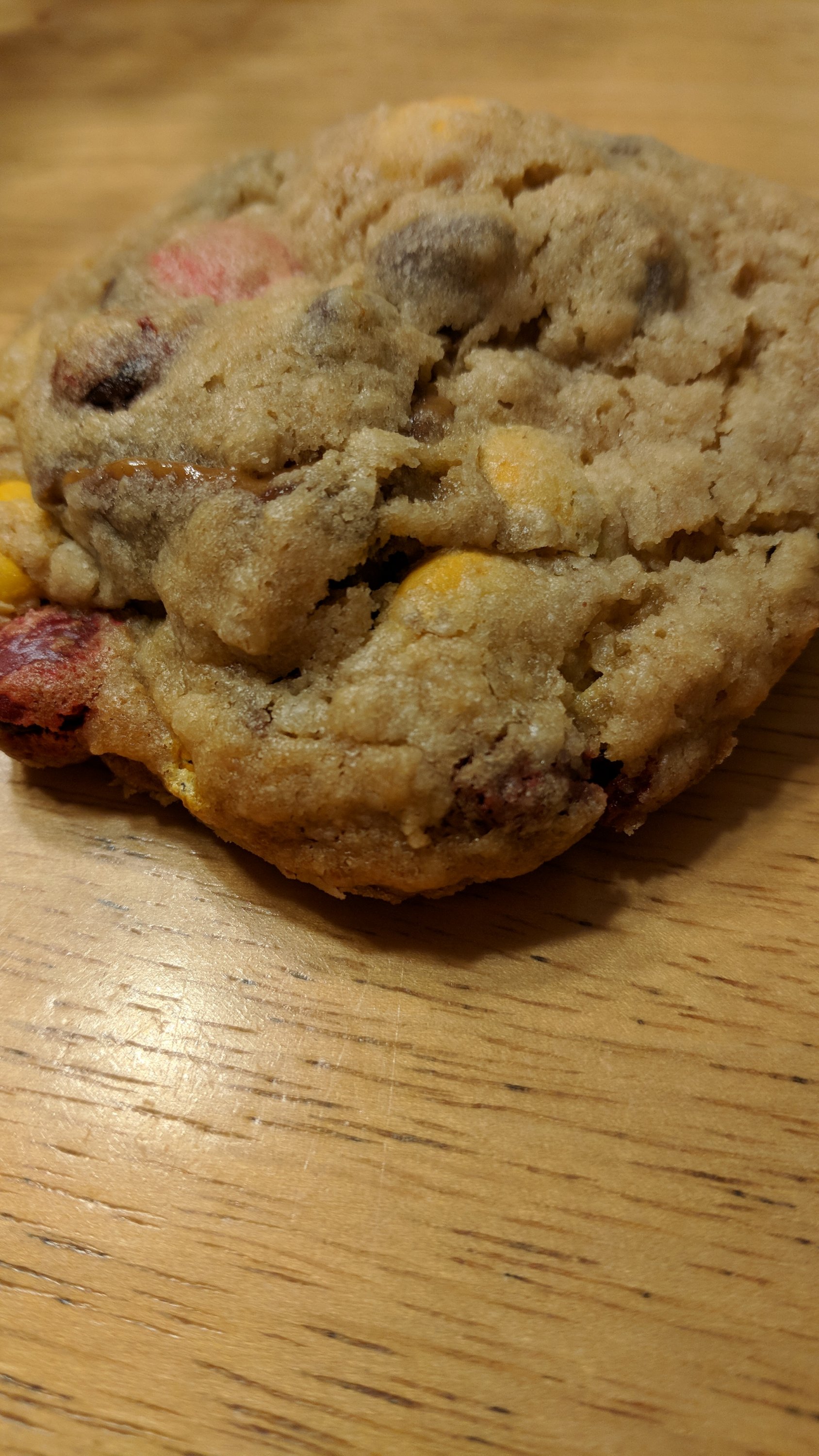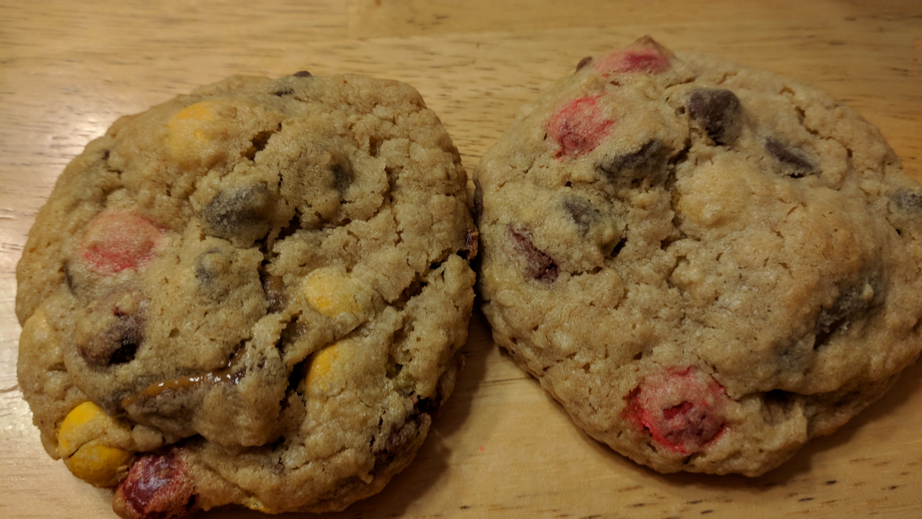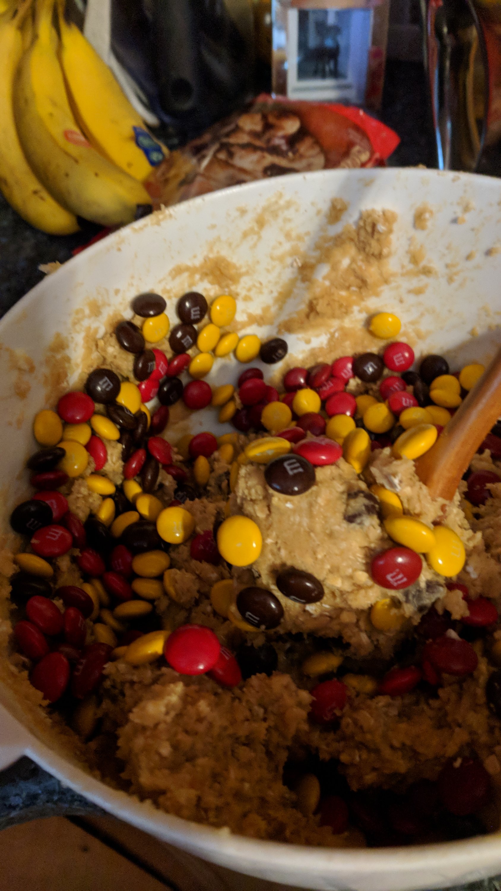 Ingredients – 17.5 oz peanut butter cookie mix, 17.5 oz chcolate chip cookie mix, 1/ 1/2 cups quick oats (uncooked), 3 eggs, 1 cup butter (softened), 2 cups m&Ms, candies