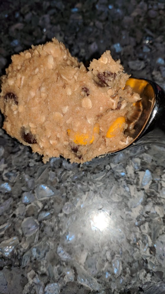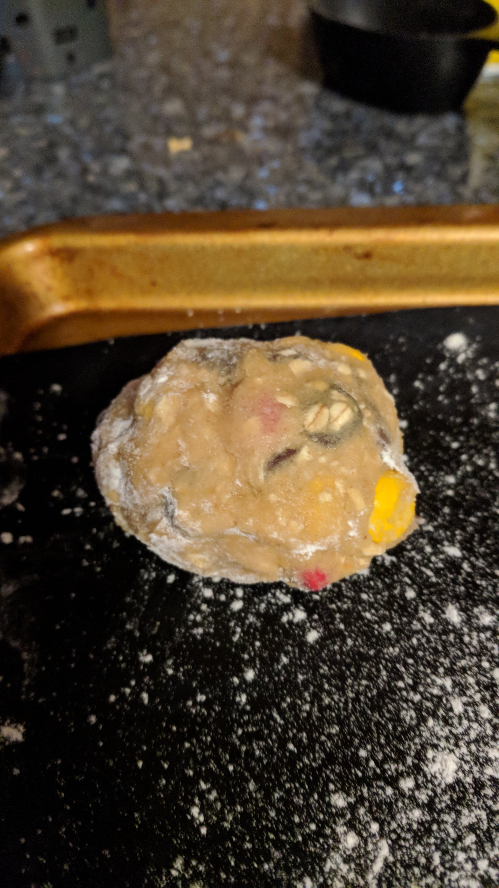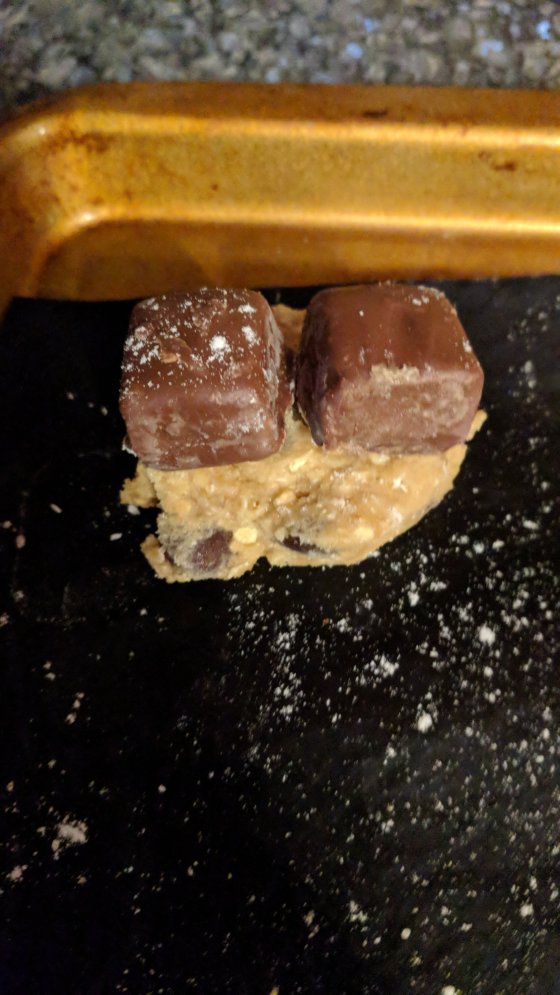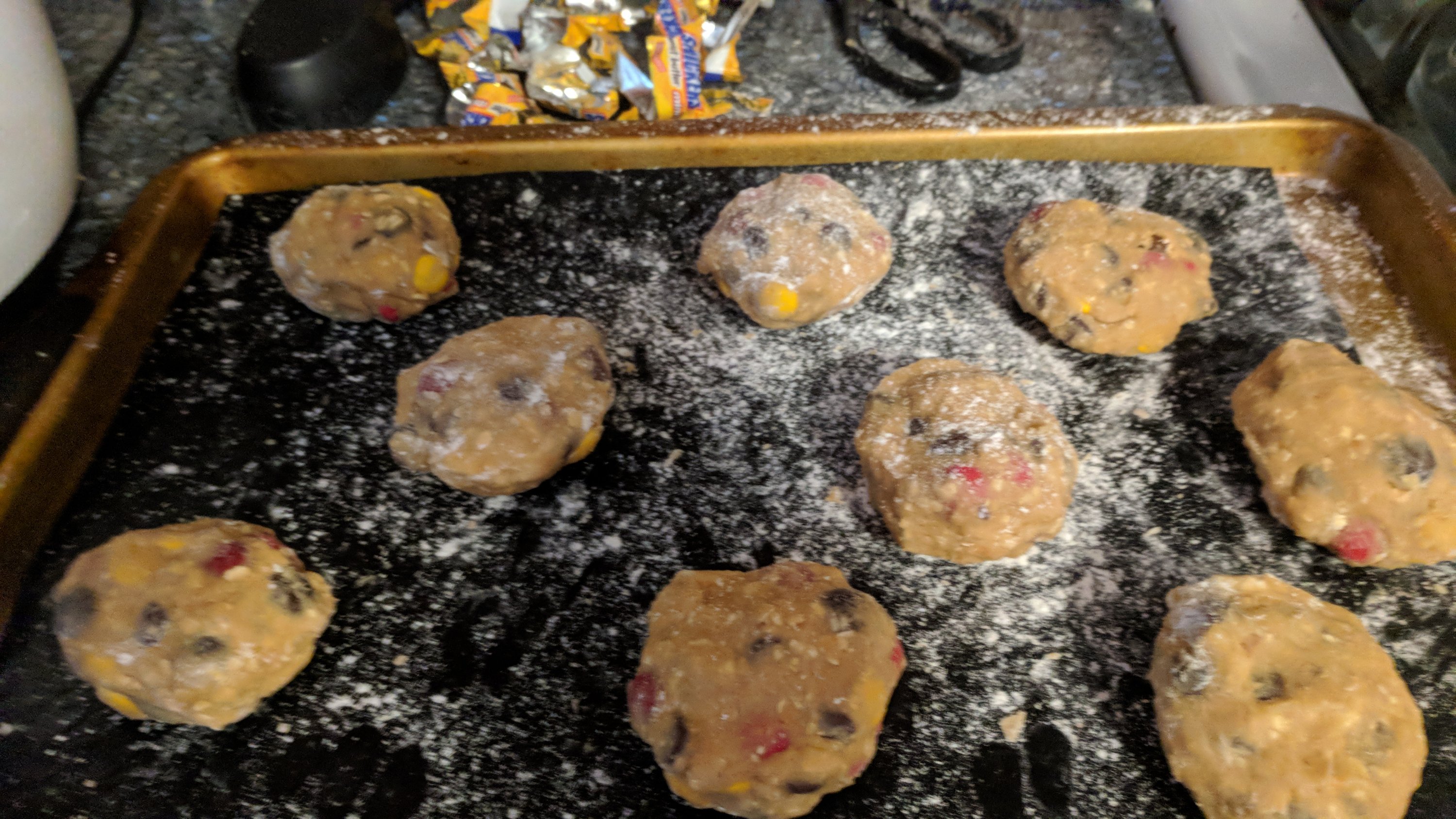 For the first time ever, Rob and I ran out of candy on Halloween! 250 candy bars gone by 730! I had to work until 7, so Rob was solo! No leftover candy meant I needed to go buy candy today to bake with. I chose an easy monster cookie stuffed with mini panut butter cups and mini peanut butter Snickers. I actually stuffed 2 candies in each cookie. π The recipe is from Betty Crocker and uses 2 of her cookie mixes.