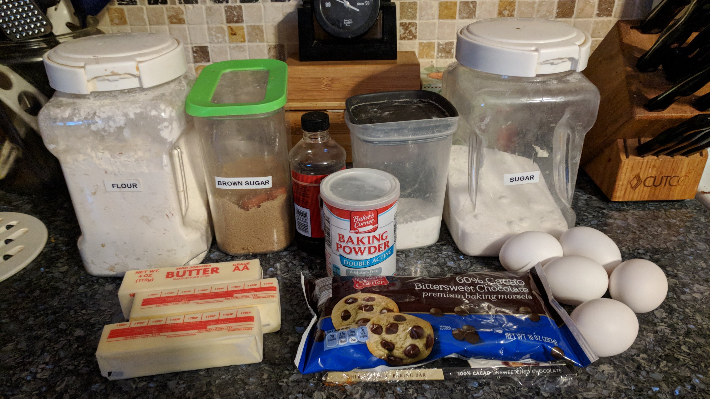 Ingredients – 3 sticks butter, 1 lb bittersweet chocolate, 1/2cup sugar, 1cup brown sugar (firmly packed into measuring cup), 5 eggs,2 tbs vanilla, 1 1/3 cups flour (scooped from flour container into measuring cup), 1/2tbs baking powder,1/2 tsp salt.