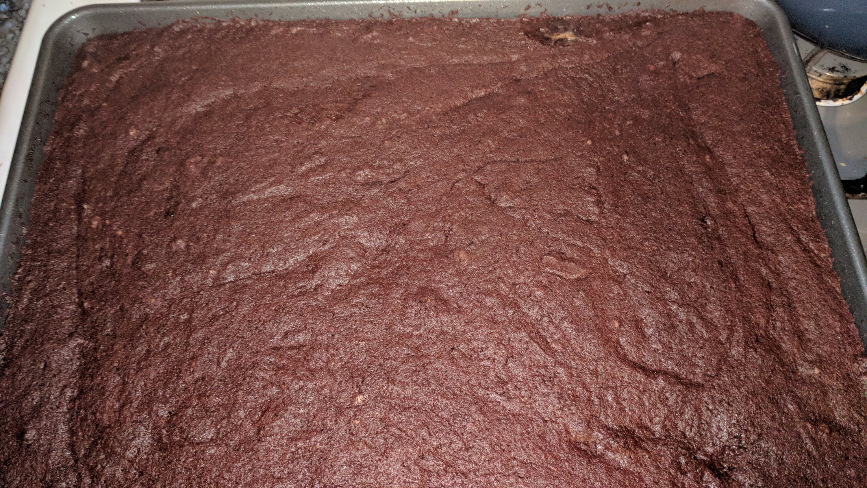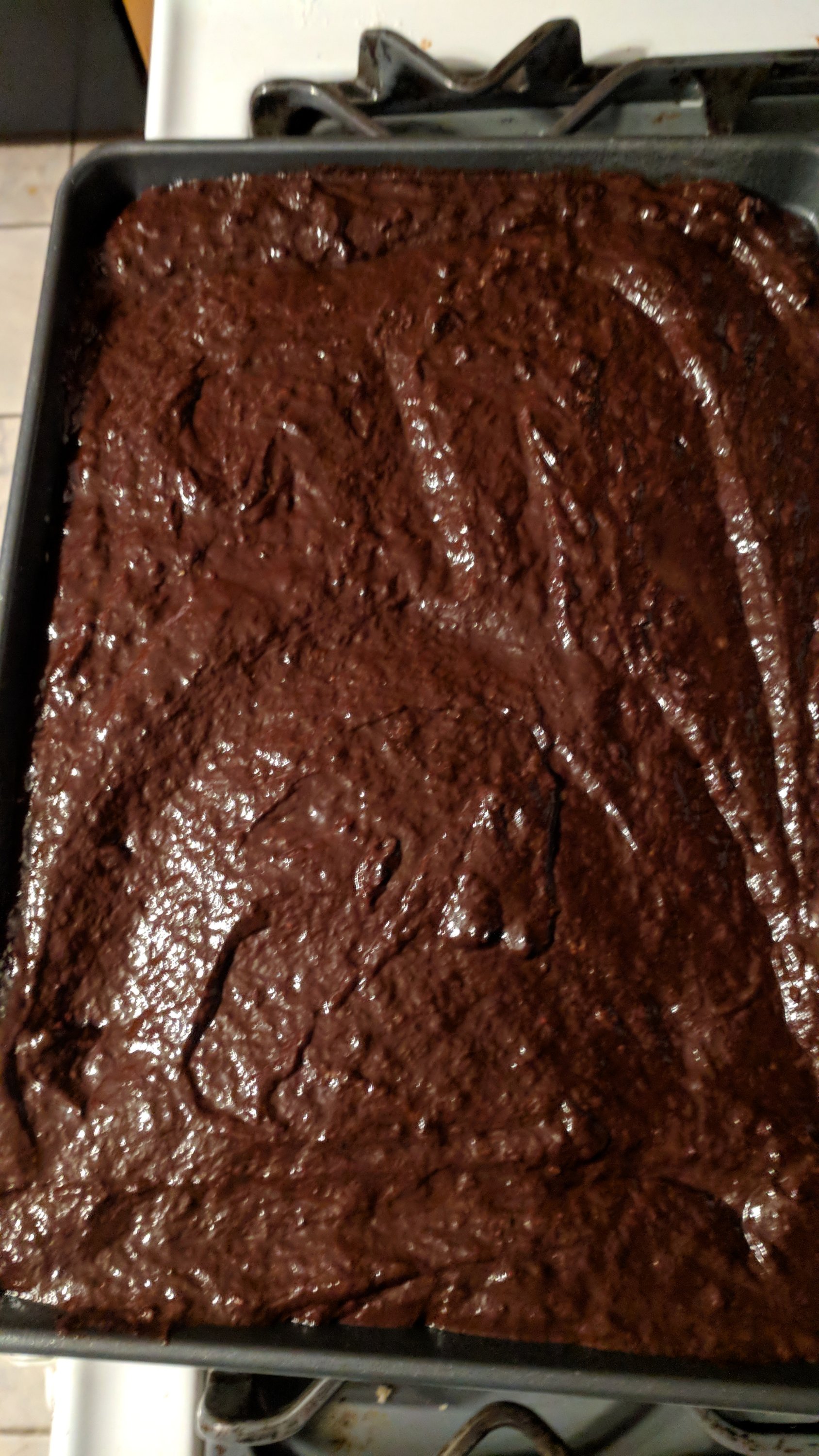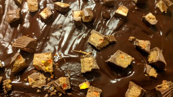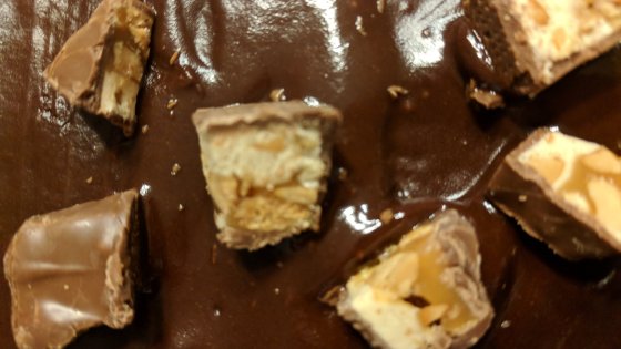I supersized a brownie recipe… So instead of using an 8×8 pan, I used a 12×18 pan. The more brownies, the better, right? I used bittersweet chocolate because I feel it makes a more fudgy brownie, but you can use semisweet chips if you want to. I also topped these with a ganache and some chopped up candy – the king sizes Reese’s with Reese’s pieces inside,courtesy of my coworker,Michelle Smallmon, Snickers and krackel bars. I would have made a baking video of these but my allergies make me sound like a mix of Marge Simpson and Rudolph after his father covered his nose. So just a blog today.