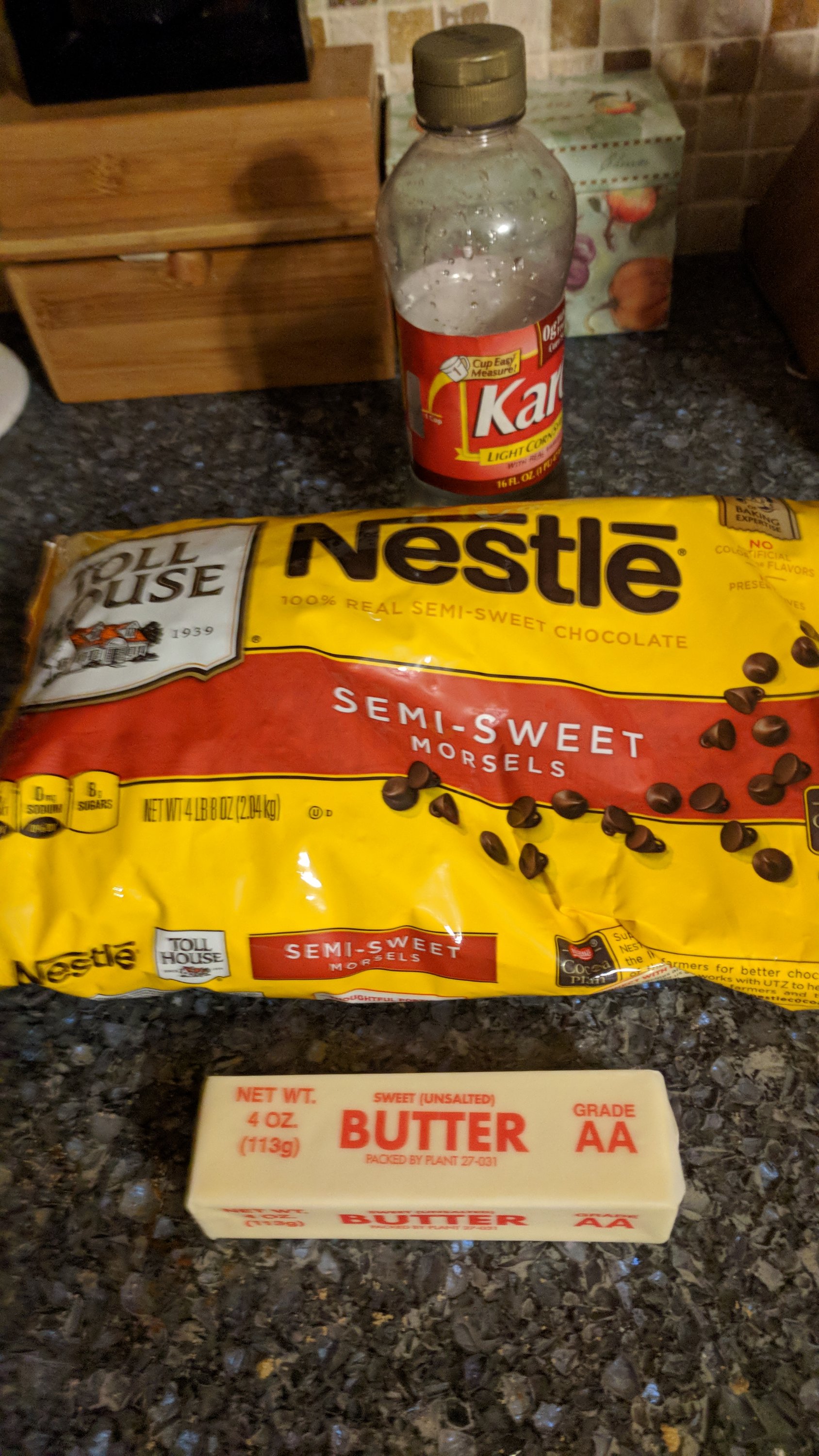 Icing ingredients -1 1/4 cups chocolate chips, 3 tbs corn syrup, 1 stick butter.