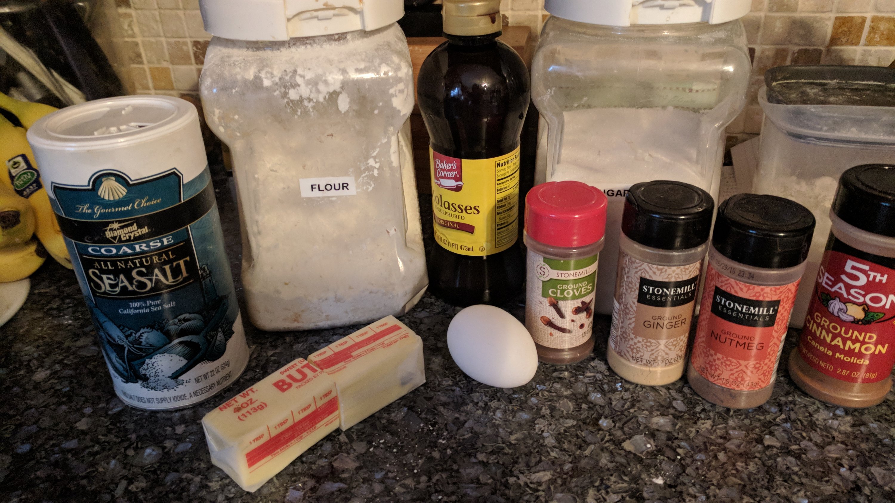 Ingredients – 1/2 cup butter (softened to room temperature), 1/2 cup sugar, 1 egg, 2/3 cup molasses, 3 cups flour (scooped from your flour bag into your measuring cup so you get the correct amount)1/2 tsp salt, 3/4 tsp baking soda,2 tsp ginger, 1 tsp cinnamon, 1/4 tsp nutmeg, 1/4 tsp ground cloves, 3 tbs water.