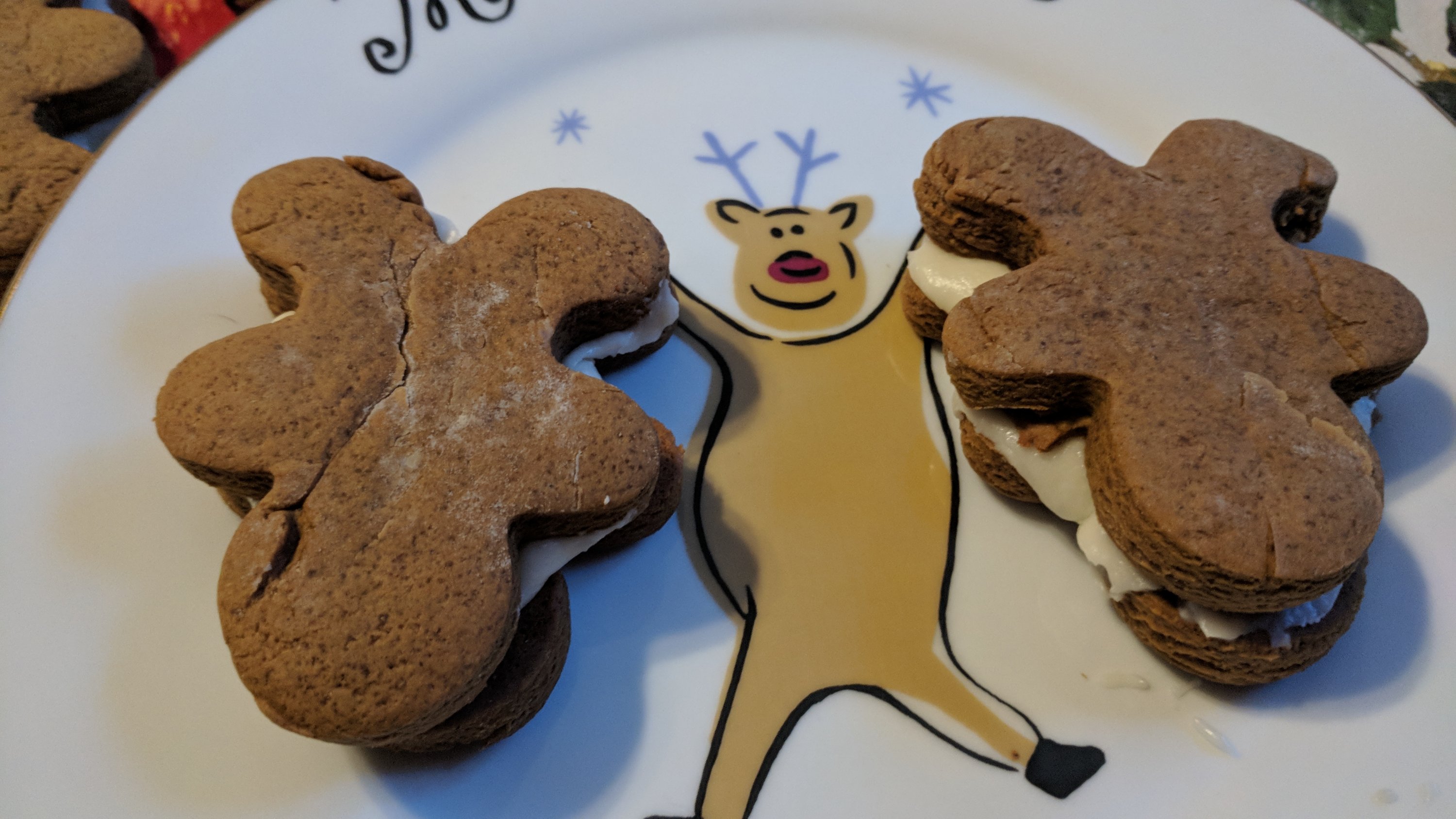 Couple of notes – I can’t decorate, so I made these into sandwich cookies with a buttercream filling. I added 3 tbs of water to the cookie dough to make it easier to work with. You can leave it out if you want. And you can make these as gingerbread men..