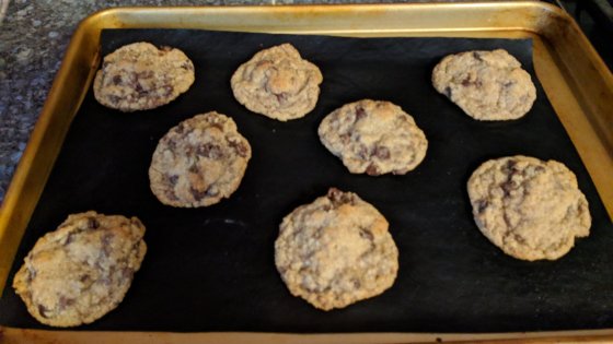 Directions – finely drive oats in food processor. Set aside. Grate milk chocolate bar (you can use a gratee. I used a food processor. You could probably also use a blender. In a separate bowl, cream butter,sugar and brown sugar. Add eggs and vanilla. Mix in ground oats. Fold in dry ingredients. Add grated milk chocolate. Blend in chips. Roll into 2-3 tbs of dough into mounds. Chill for an hour or so. Preheat oven to 375. Line cookie sheets with nonstick baking liners. Stagger 8 cookies on a sheet.