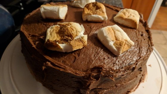 I decided to bake a smores cake because it is a summer treat and I am tired of cold weather and want it to be sunny and warm. I have also put out our patio furniture, hoping to hurry nice weather! So if it rains the next ten days, it is my fault! 😉