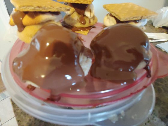 For smores – break graham cracker sheet in. Layer 1/2 Graham cracker sheet with a tsp melted chocolate, a pb cookie, 1 toasted marshmallow, 1 tsp melted chocolate and top with other Graham cracker half.