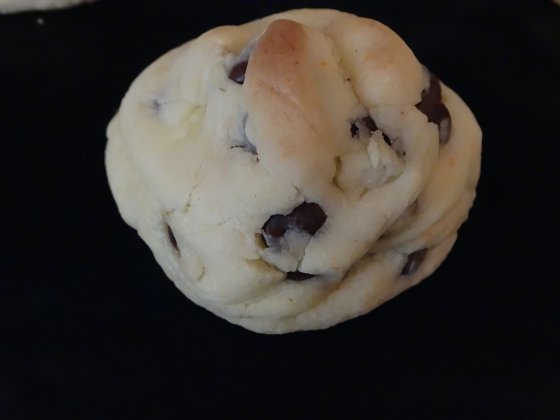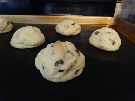 Combine cake mix, flour, oil and eggs. Plenty in chips. Maybe add a little more flour to make dough easier to handle. Using a cookie scoop (about 1/4 cup of dough), scoop out door and form into high piles. Let chill at least an hour.