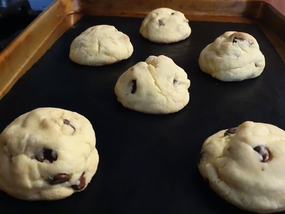 Got a request from my husband today for Chocolate Chip cookies. this is one of the 257 I have in my recipe box! (give or take a few). It is super simple, uses a cake mix, eggs, oil, water, flour and chocolate chips. I added a little extra flour because the dough was a little sticky and I prefer my cookies to come out puffy and use the flour to stiffen the dough so I can pile it high to keep it from spreading too much. I used a yellow cake mix today, but you can use any flavor you want and any chips that you want (think chocolate cake mix and peanut butter chips). These are super simple and look great!