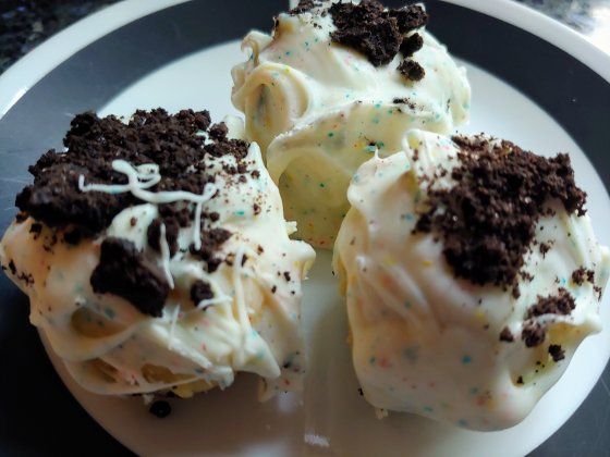 Limiting the use of my oven is a wonderful thing this time of year. I have a handful of no bake recipes to choose from. These cake truffles can use any flavor cake mix you want., same goes for the chips you melt for the coating. I used a yellow cake mix and confetti chips.. They’re white chocolate chips with tiny sprinkles in them. And I topped them off with crushed Oreos.