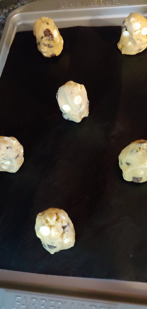 Chill a few hours. Preheat oven for 20 minutes to 350 degrees. Stagger cookie,dough on a sheet that has been lined with nonstick baking liners.
