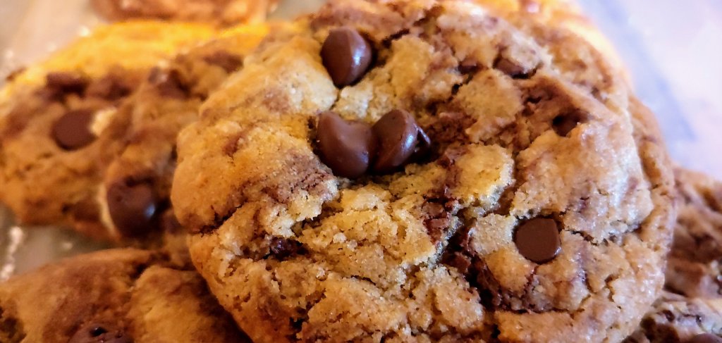 Directions – brown butter, stirring occasionally. you will see little specs of brown in the bottom. Remove from heat and pour in a mixing bowl. Add brown sugar and sugar. Stir in eggs and vanilla. Fold in dry ingredients. Add mini chips. Scoop out 1/4 cups of dough. Chilla few hours. Preheat oven,for 20 minutes. Stagger dough on a cookie sheet lined with nonstick baking liners. Gently press semisweet chips on top. Bake 10 to 13 minutes. Cool completely. Store in covered container.
