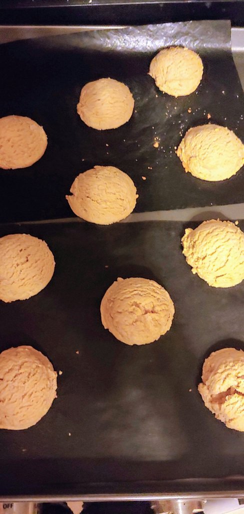 Directions – cream Crisco, butter, peanut butter, sugar and brown sugar. Add egg, vanilla and milk. Fold in dry ingredients. Scoop out 1/4 cups of dough into mounds. Chill a few hours or overnight. Preheat oven to 350 for 20 minutes. On a cookie sheet lined with nonstick baking liners. Stagger cookies.