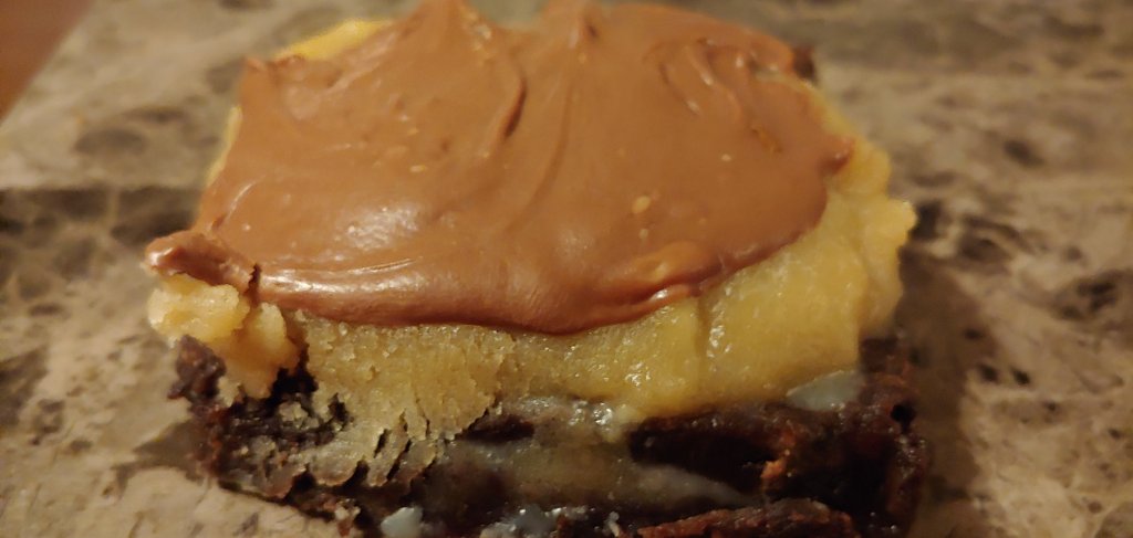 If you want a simple dessert that can really impress people, this is it – cookie dough brownies! What’s not to like – you have brownies, you have cookie dough, you have melted chocolate on top! This is treat 2 for football Friday #3 at ESPN radio. I was in a hurry and melted the butter, which I do NOT recommend doing because it was too gushy and I had to add more flour. I used melted milk chocolate on some melted dark chocolate on the others. Why, you ask? Because I didn’t melt enough milk chocolate. Whenever I melt chocolate or make frosting, I make too much and don’t know what to do with it, or I don’t make enough and I have to make more and still end up with too much! Oh, and I cheated and used a brownie mix. Remember to preheat your oven for 20 minutes before baking. Also, I microwaved the flour, in a microwave safe bowl for 25 seconds, stirred it, then microwaved another 25 seconds. (Some people have concerns about eating raw flour)