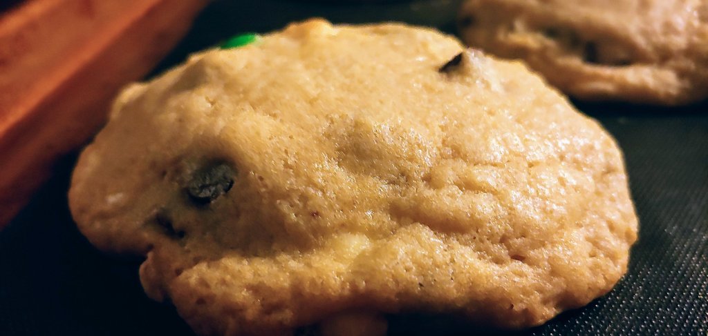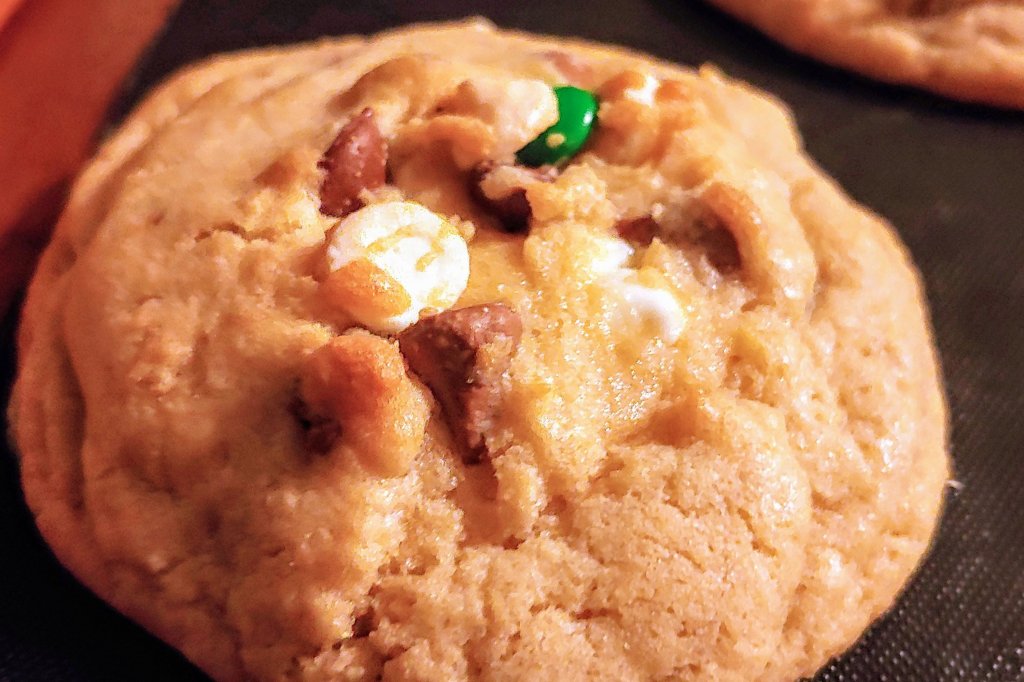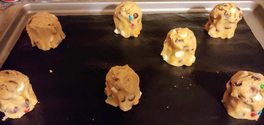 Directions – cream butter, Crisco, brown sugar and powdered sugar. Add eggs and vanilla. Stir in dry ingredients. Mix in chips and m&ms. Scoop out 1/4 cups of dough. Chill a few hours in a Tupperware container. Preheat oven to 330 degrees for 20 minutes. Stagger on a cookie sheet lined with nonstick baking liners.