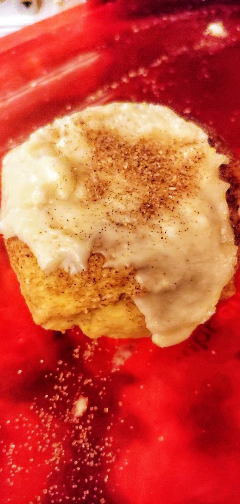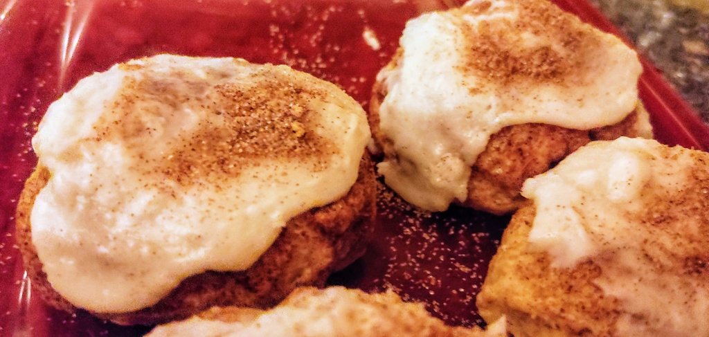 Frosting directions – combine and frost cookies. Sprinkle with cinnamon sugar. Store in covered container.