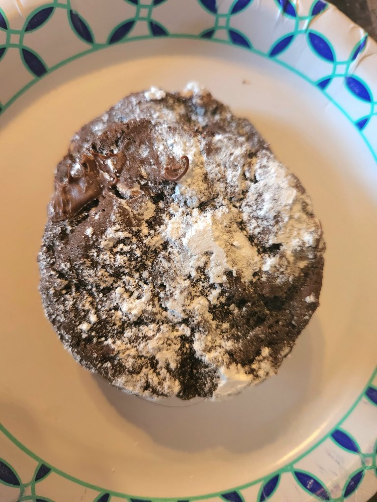directions – cream butter, sugar and brown sugar. Add egg, vanilla and wine. Blend in dry ingredients. Mix in chips. scoop out 2 tbs of dough and roll into balls. Chill a few hours. preheat oven to 375 degrees before baking. Line a cookie sheet with nonstick baking liners or parchment paper. stagger cookies on the prepared sheets. bake 10 to 11 minutes. sprinkle warm cookies with powdered sugar. Cool completely. Sprinkle with more powdered sugar. I opted to put melted milk chocolate on the bottoms of the completely cooled cookies, but I am sure they are fine without it. 🙂 Store in covered container.