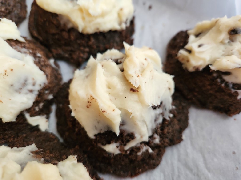 Directions – cream butter, sugar, brown sugar and powdered sugar. Add eggs, oil and vanilla. Blend in dry ingredients and crushed oreos. Scoop out 1/4 cups dough and form tall mounds. Chill a few hours. Preheat oven to 350 degrees for 20 minutes. Line a cookie sheet with parchment paper. Stagger cookies on sheet. Bake 9 to 11 minutes (no longer than 11). Cool completely.
