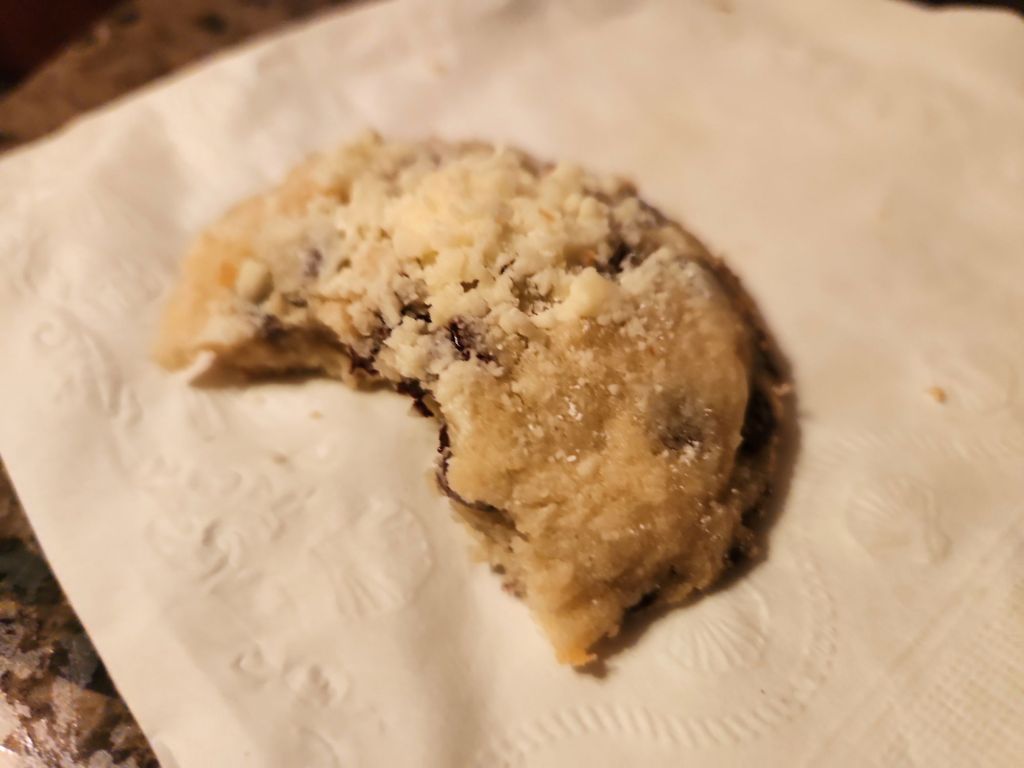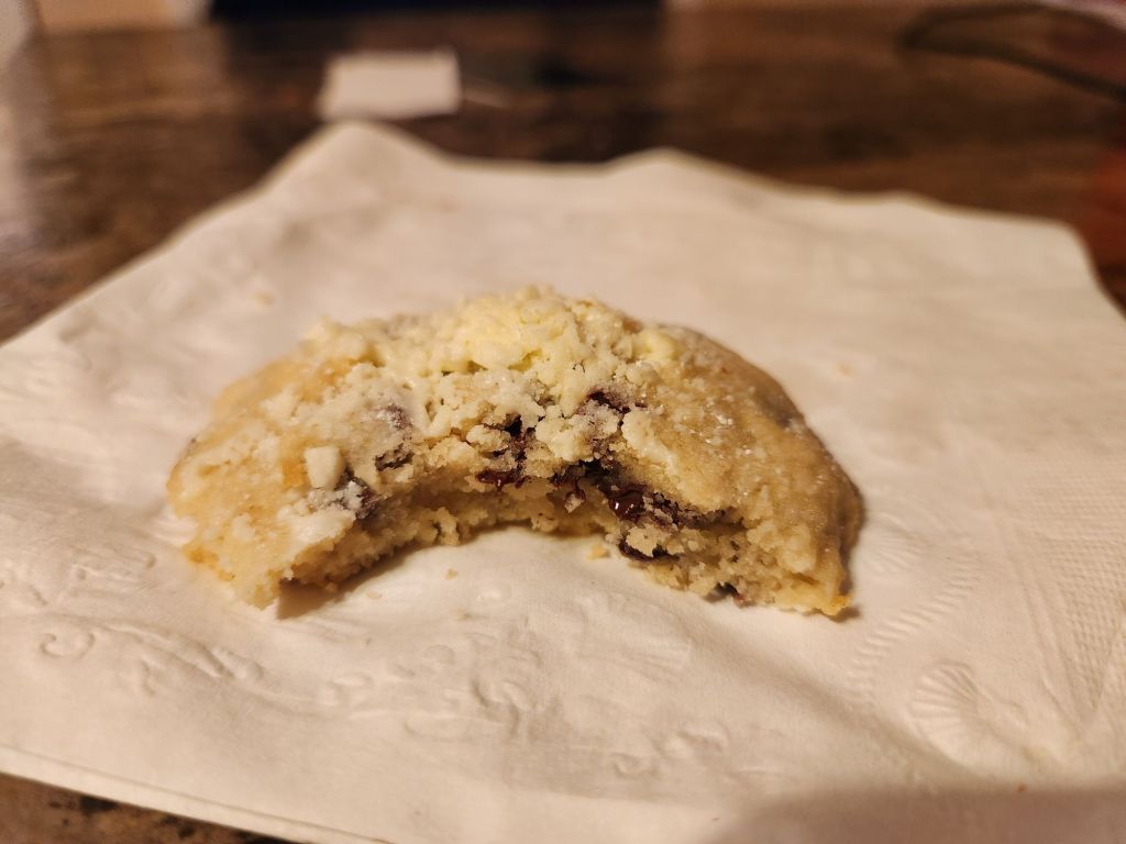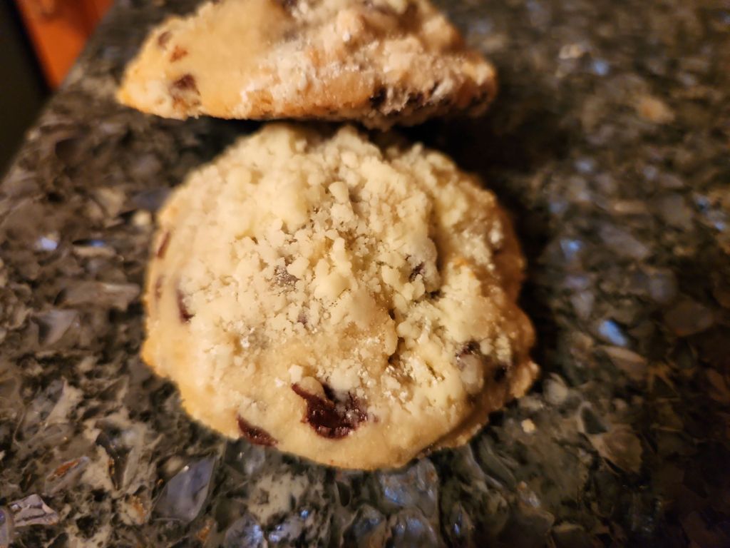 Directions- preheat oven to 375 degrees. Line a cookie sheet with parchment paper. In a bowl, cream butter and powdered sugar. Add vanilla. Fold in flour, one cup at a time. Mix in chips. Scoop out 1 1/3 tbs dough (I used a cookie scoop). Stagger on prepared sheet. Bake 10 to 12 minutes. Sprinkle warm cookies with powdered sugar. Cool completely. Sprinkle with more powdered sugar. Store in covered container.