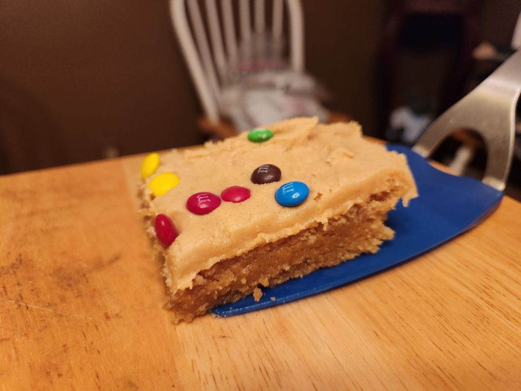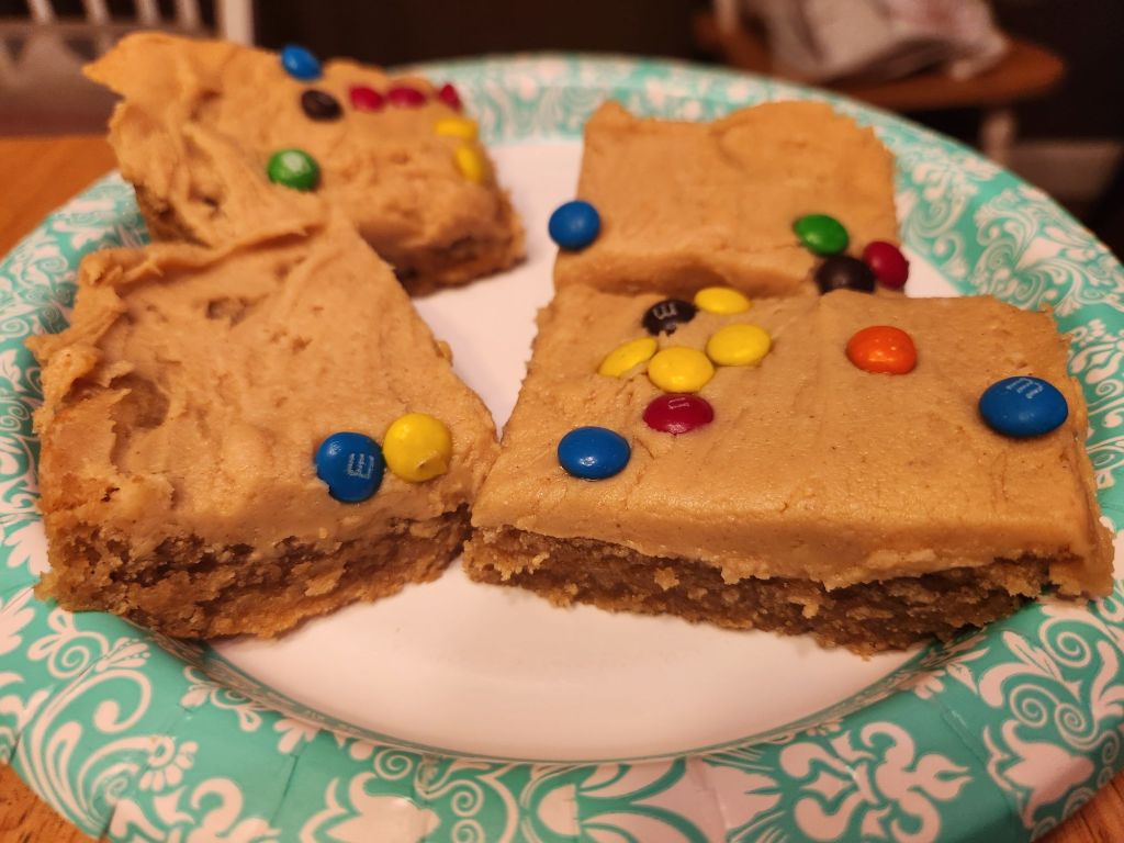 For part 2 of the first round of the men’s NCAA tournament and the opening day of the women’s tournament, I present peanut butter bars with peanut butter frosting and topped with some mini m&ms.