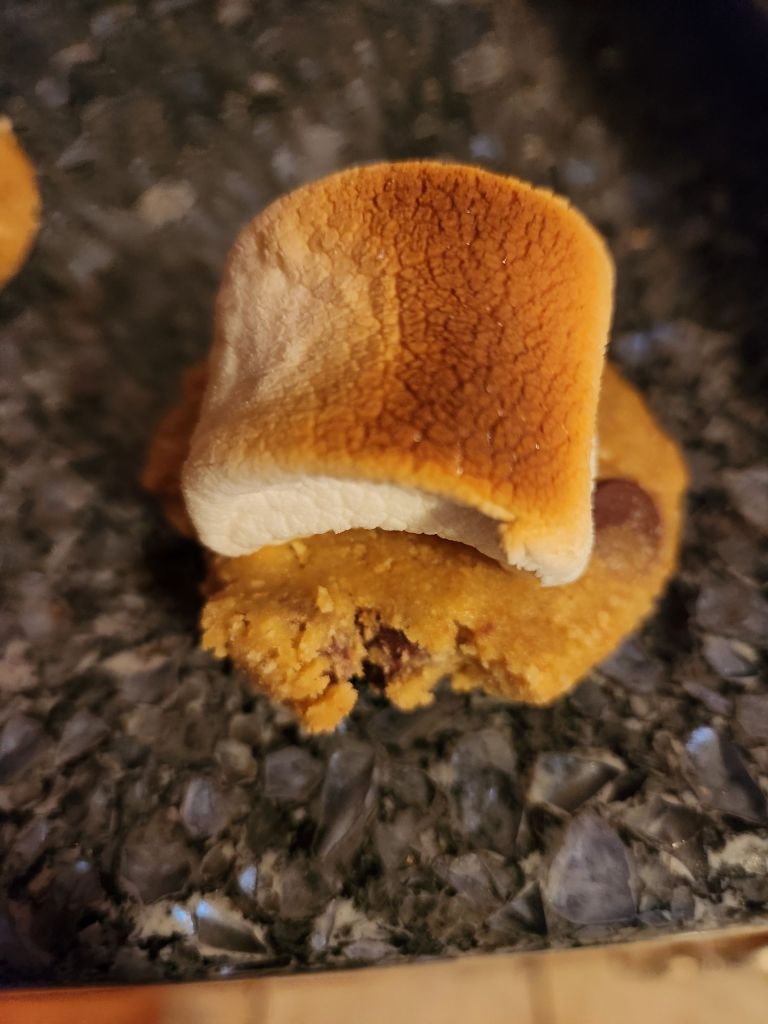 In a bowl, cream butter, sugar and brown sugar. Add eggs and vanilla. Blend in dry ingredients, then graham cracker crumbs. Fold in chips. Scoop out 1/4 cups dough. Divide in half. Place a toasted marshmallow in one half.