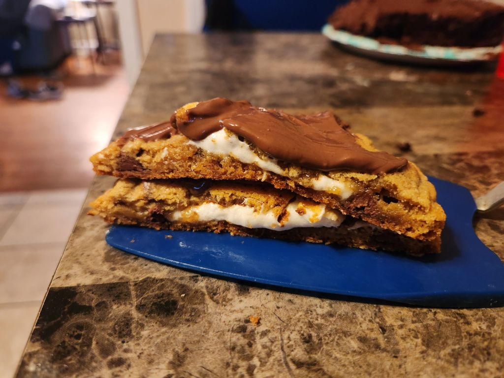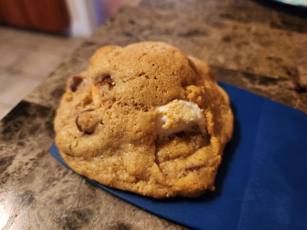 I wanted to make something a little different than chocolate chip cookies, so I opted for smores chocolate chip cookies stuffed with toasted marshmallows. They are a pretty big cookie. Some of them could not contain the marshmallows, so I cut them in half and made them sandwich cookies and topped them with melted hershey kisses.