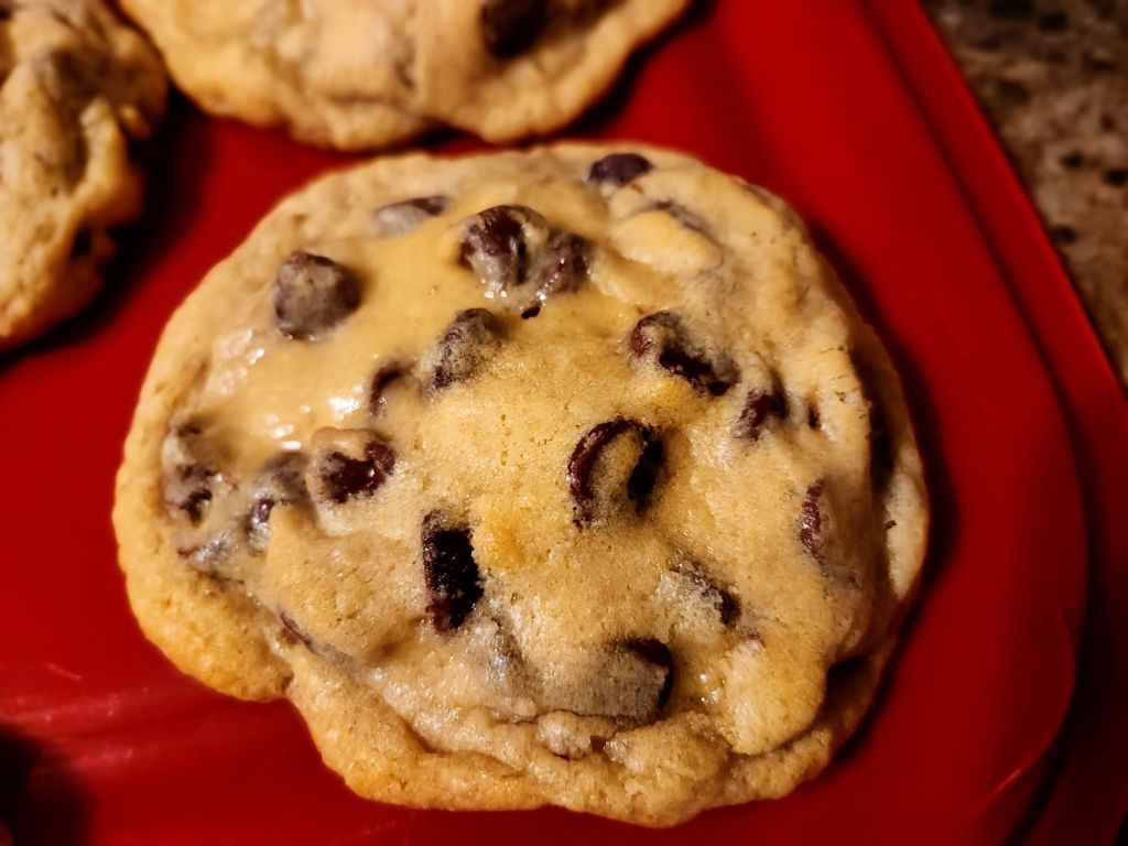 Directions – in a bowl, cream butter, brown sugar and sugar. Add eggs and vanilla. Blend in dry ingredients, then chips. Scoop out 1/4 cups of dough. Chill a few hours. Preheat oven to 350 degrees. Line a cookie sheet with parchment paper. Bake 12 to 14 minutes. They will be a little doughy. Pop them in the fridge to firm them up overnight.