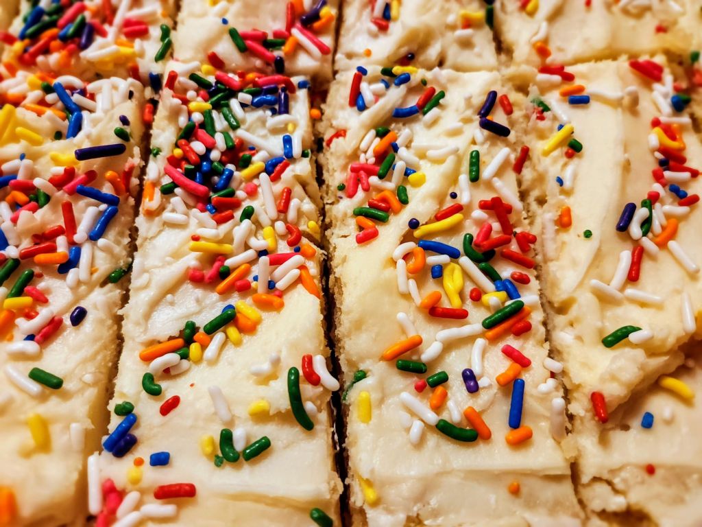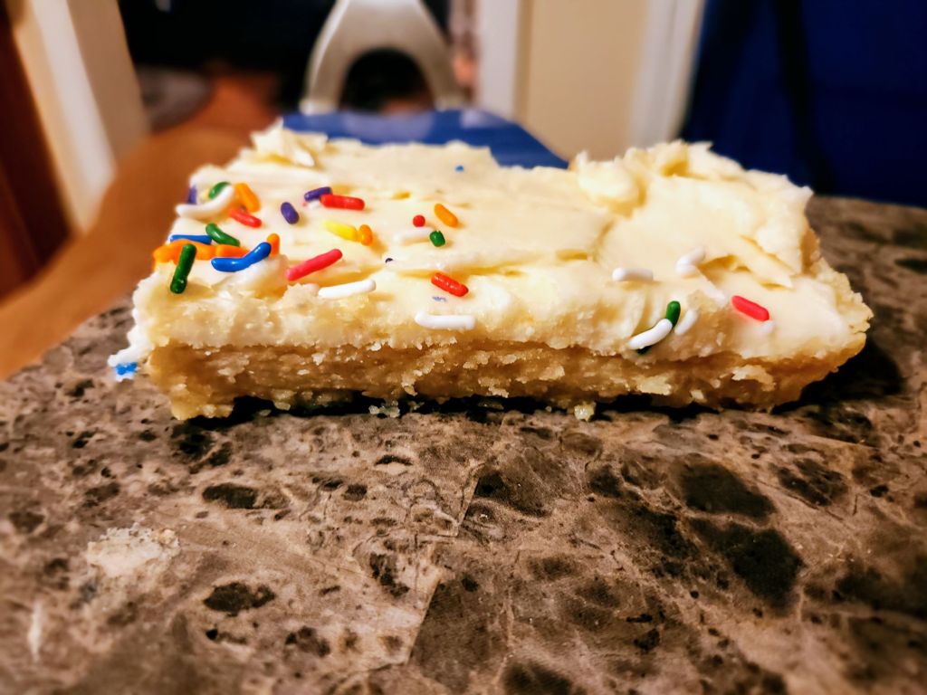 Directions – combine butter, powdered sugar and vanilla in a bowl. Add milk or cream, a tbs at a time, until you get the consistency you want. Spread over bars. Sprinkle with sprinkles. Store in a covered container in fridge.