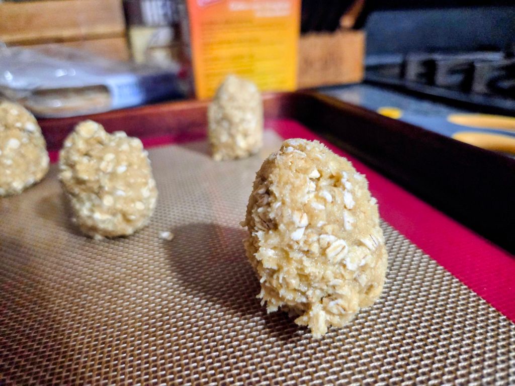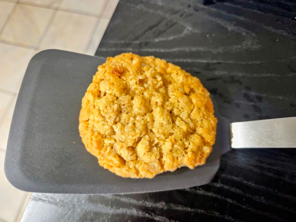 Directions – preheat oven to 350 degrees.  Line a cookie sheet with nonstick baking liners.   In a bowl, cream butter, crisco, sugar and brown sugar.  Add eggs and vanilla.  Mix in flour, baking soda and salt.  Fold in oats.   Scoop out 3 tbs of dough and form tall mounds.