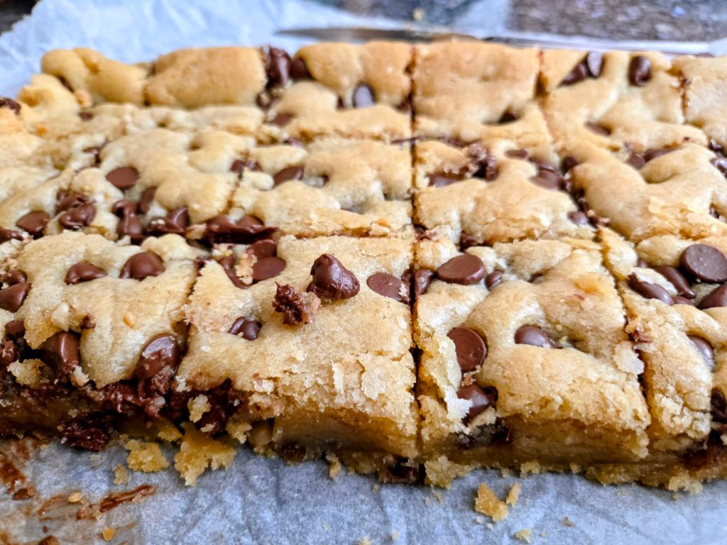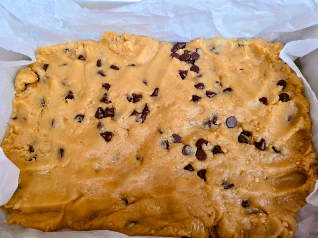 Directions- preheat oven to 350 degrees. Line a 9×13 pan with parchment paper. Set aside. In a bowl, combine oil, sugar and brown sugar. Add eggs and vanilla. Mix in dry ingredients. Stir in 1 cups chips. Evenly press into prepared pan.