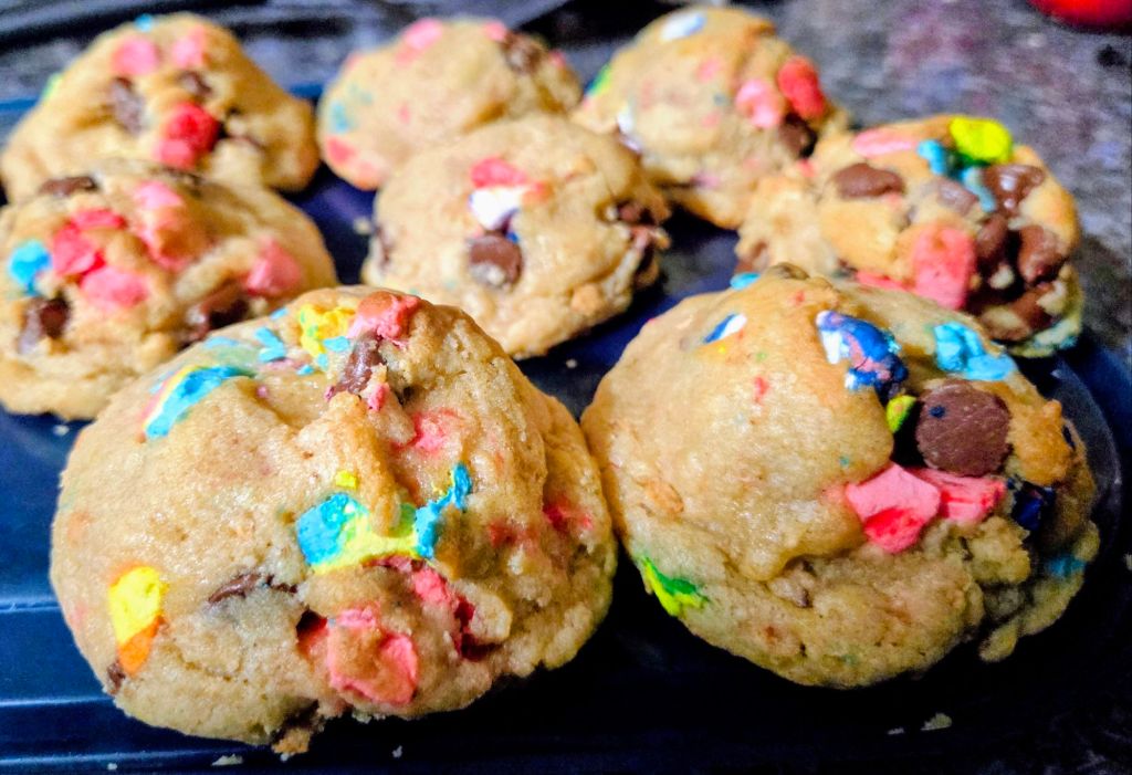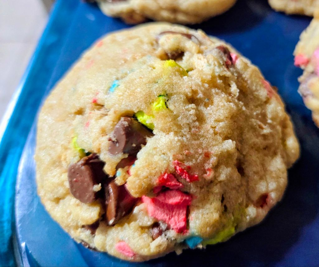 Like so many other people, we have had a brutal stretch of cold weather…. making most of us dream of summer.  And what says summer more than smores!   So I made smores cookies.   I didn’t have mini marshmallow bits, so I chopped up the marshmallow pieces from Lucky Charms cereal.