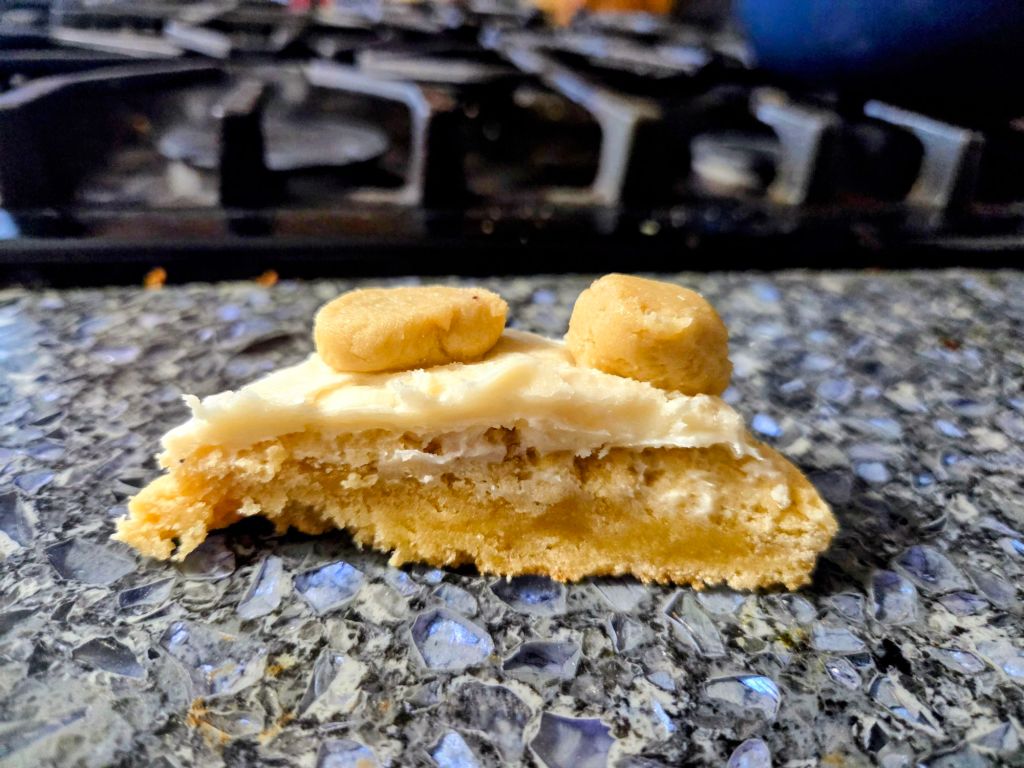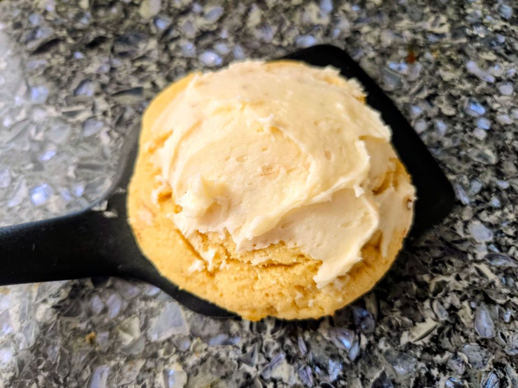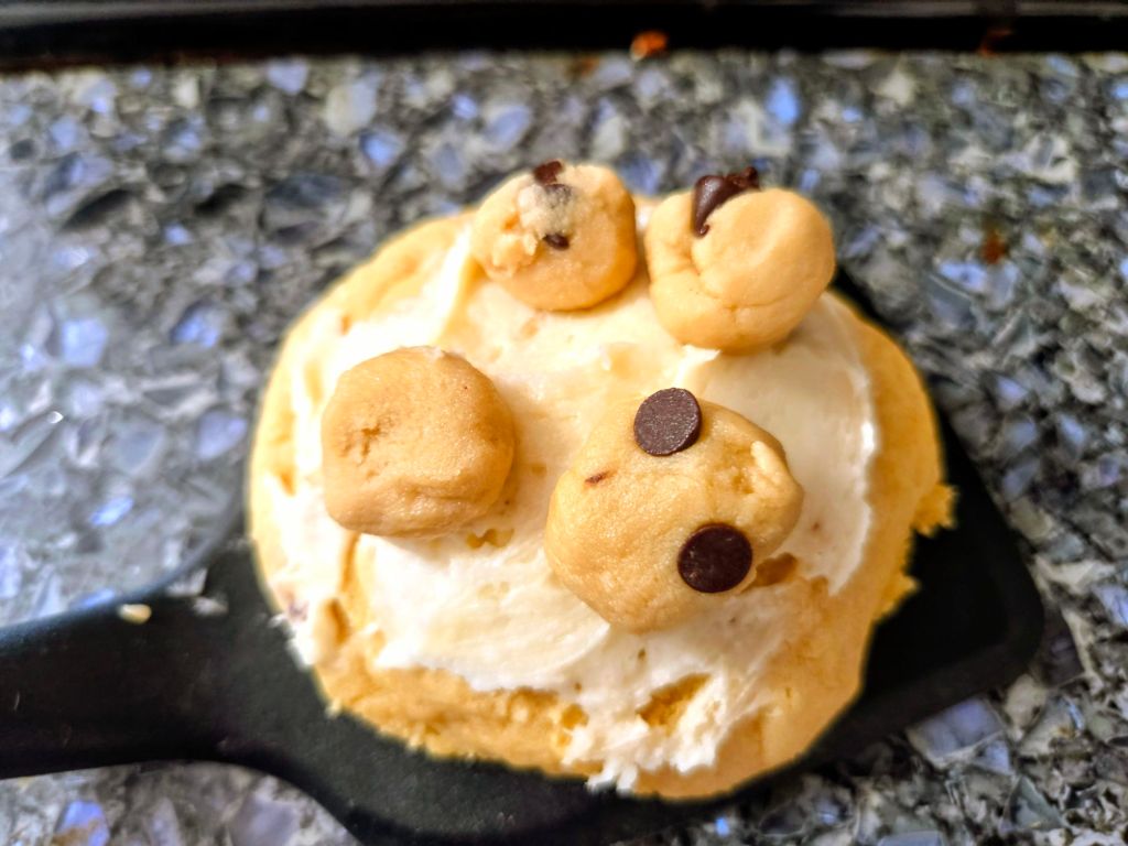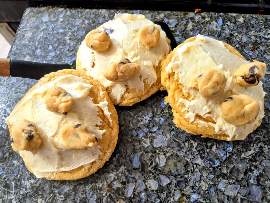 I wanted to make something with cookie dough, so these are a chocolate chip cookie without the chips, an ice cream frosting and edible cookie dough on top.