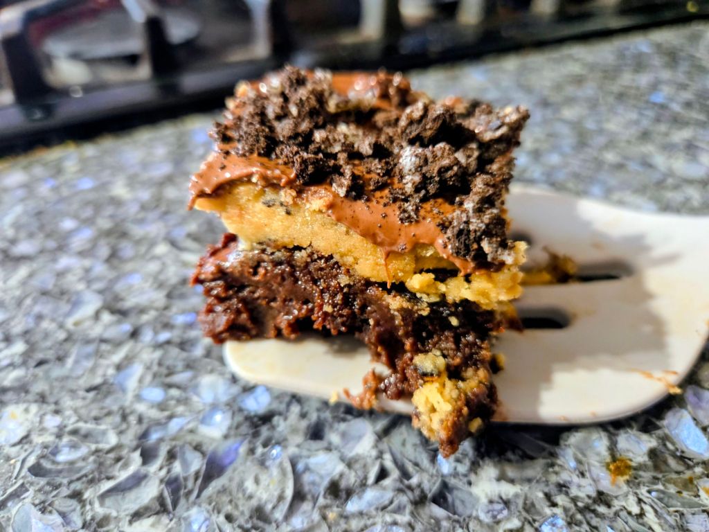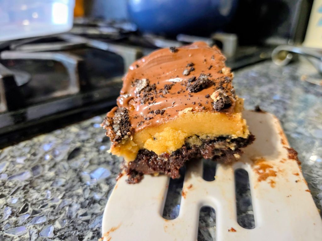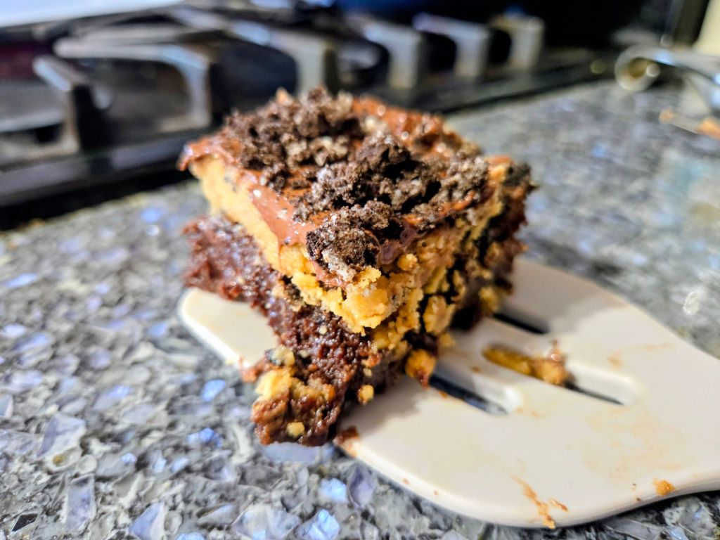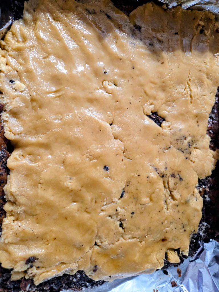 Directions – preheat oven to 350 degrees.   Line a 9×13 pan with tin foil and spray with baking spray.  Set aside.   In a microwave safe bowl, melt butter and dark chocolate chips.   Mix in brown sugar and sugar.  One at a time, beat in eggs, then vanilla.  Do not overnight.  Blend in dry ingredients.  Mix in chips. Evenly spread into pan.  Sprinkle crushed oreos on top.  Bake 25 to 30 minutes or until a toothpick inserted in center comes out with a few moist crumbs.  Cool completely.  Using the bottom of a wooden spoon, poke holes, about halfway down, in brownies.