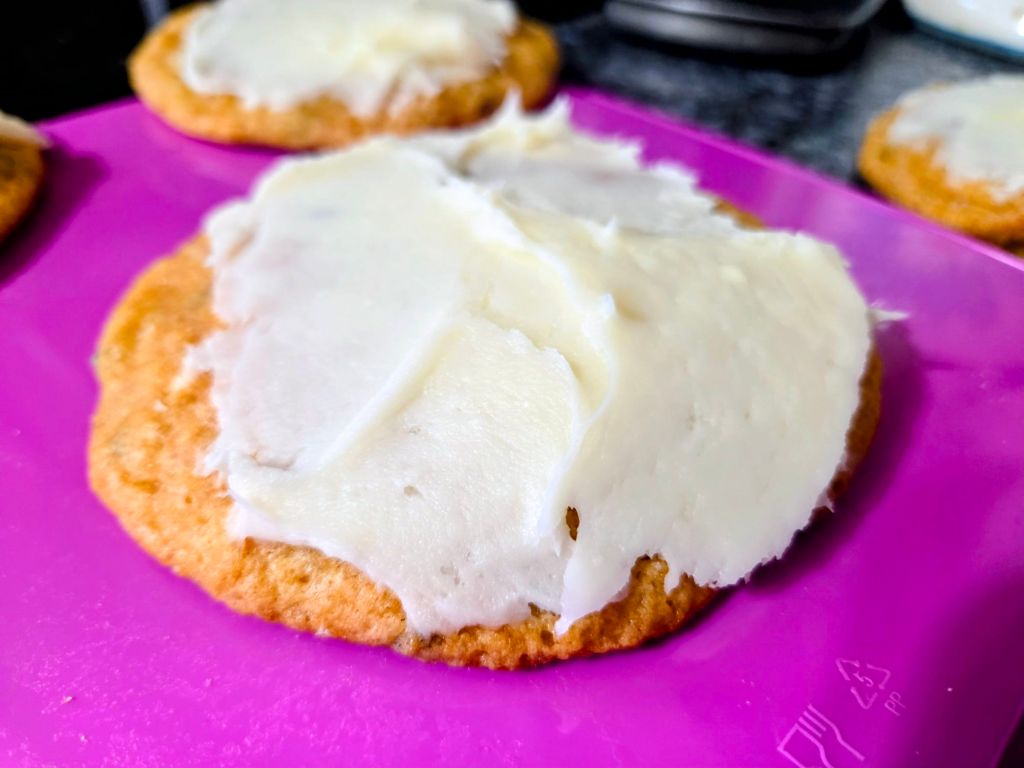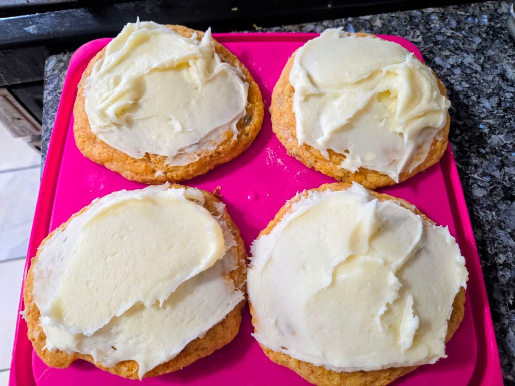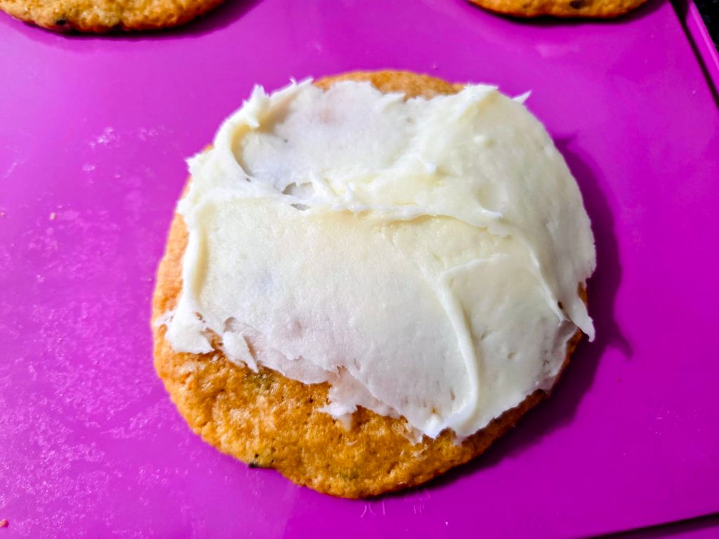 For Sabres victory treats, Rob chose carrot cake cookies with mini chocolate chips and cream cheese frosting. Grating carrots is not my favorite thing, so I used baby food carrots!