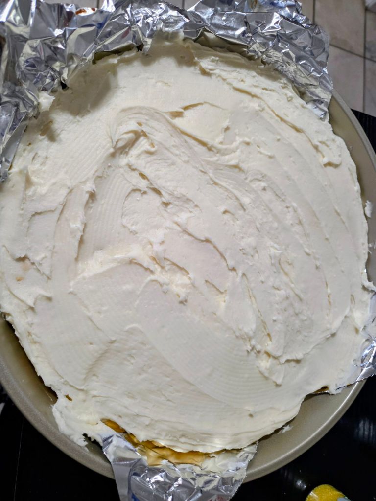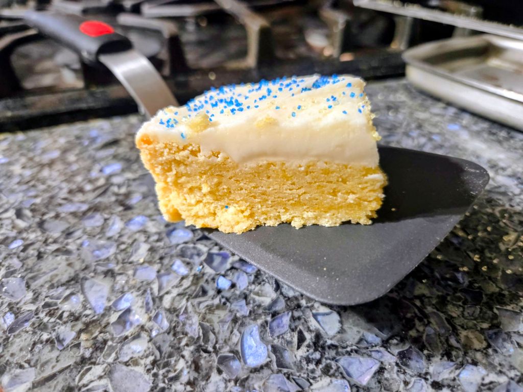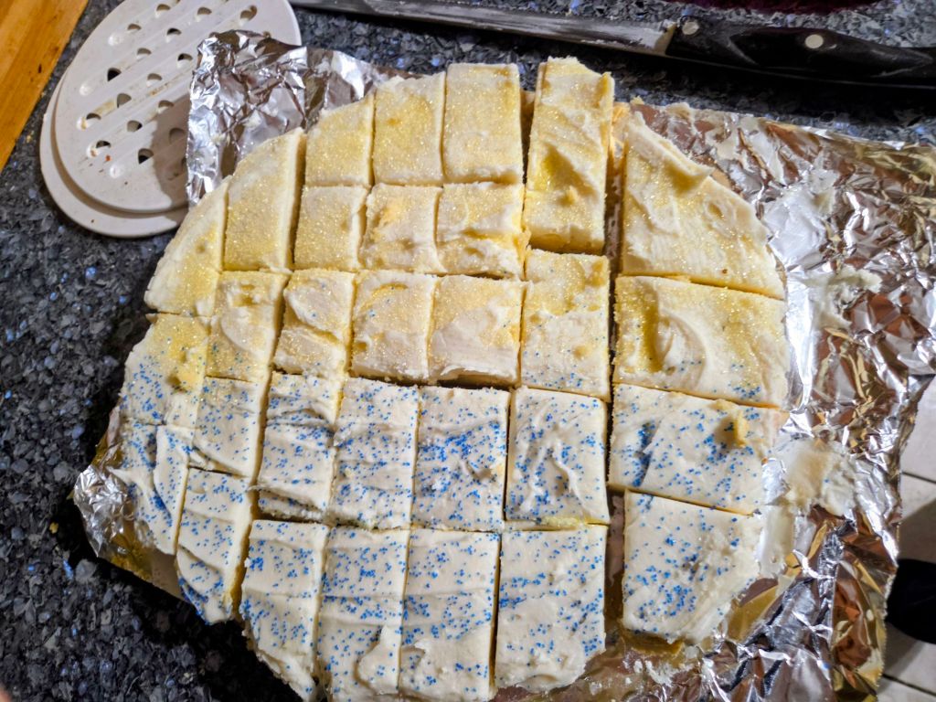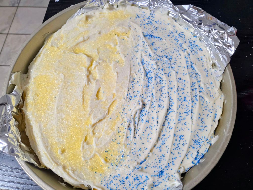 I though I would make one using a yellow cake mix, sugar cookie mix, some eggs, melted butter, vanilla and top it with a simple vanilla buttercream frosting and sprinkle it with yellow and blue colored sugar (Go Sabres).