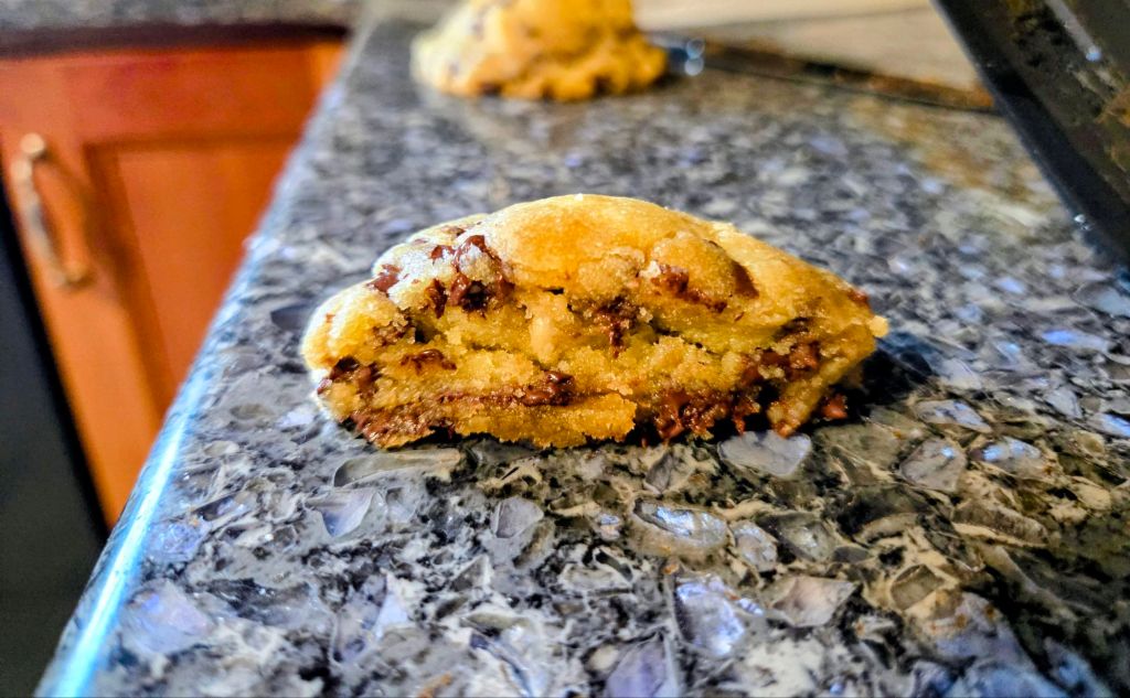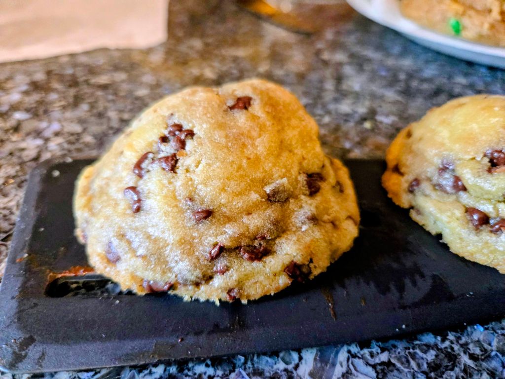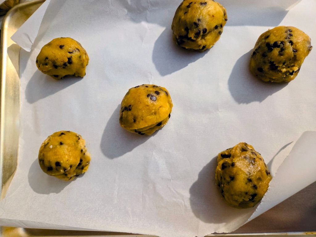 Remember to scoop your flour from your flour bag into your measuring cup so you get the right amount. Firmly packed your brown sugar into your measuring cup. I used mini chocolate chips, but you can use regular. I do recommend freezing the dough for a half hour to an hour, or chilling it in the fridge for a few hours. And preheat your oven before baking.
