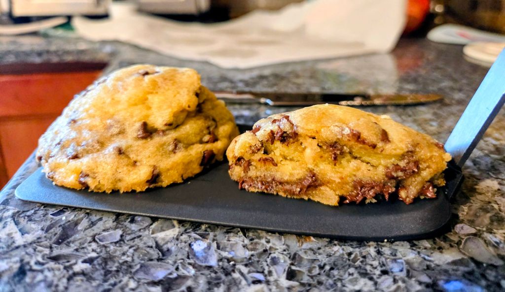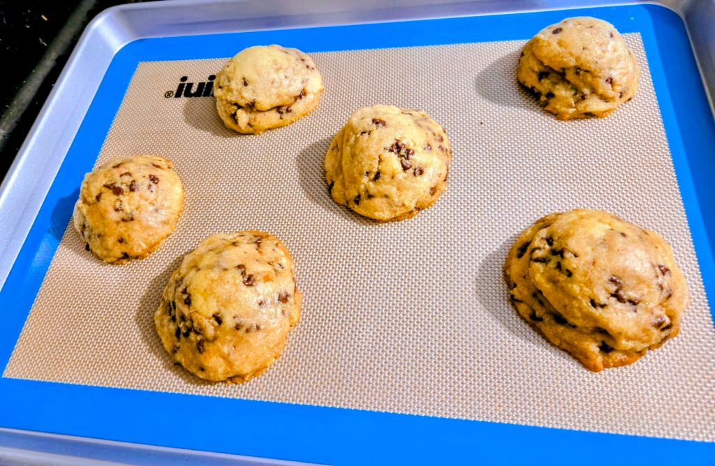 Directions – in a bowl, combine oil, sugar and brown sugar. Add egg, vanilla and water. Mix in dry ingredients. Fold in chips and nuts. Scoop out 1/4 cups dough. Freeze 30 minutes. Line a cookie sheet with parchment paper. Stagger cookies on sheet.