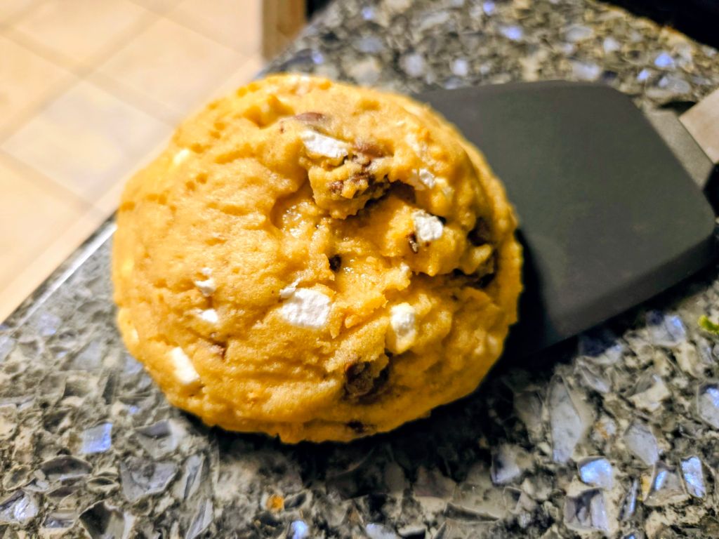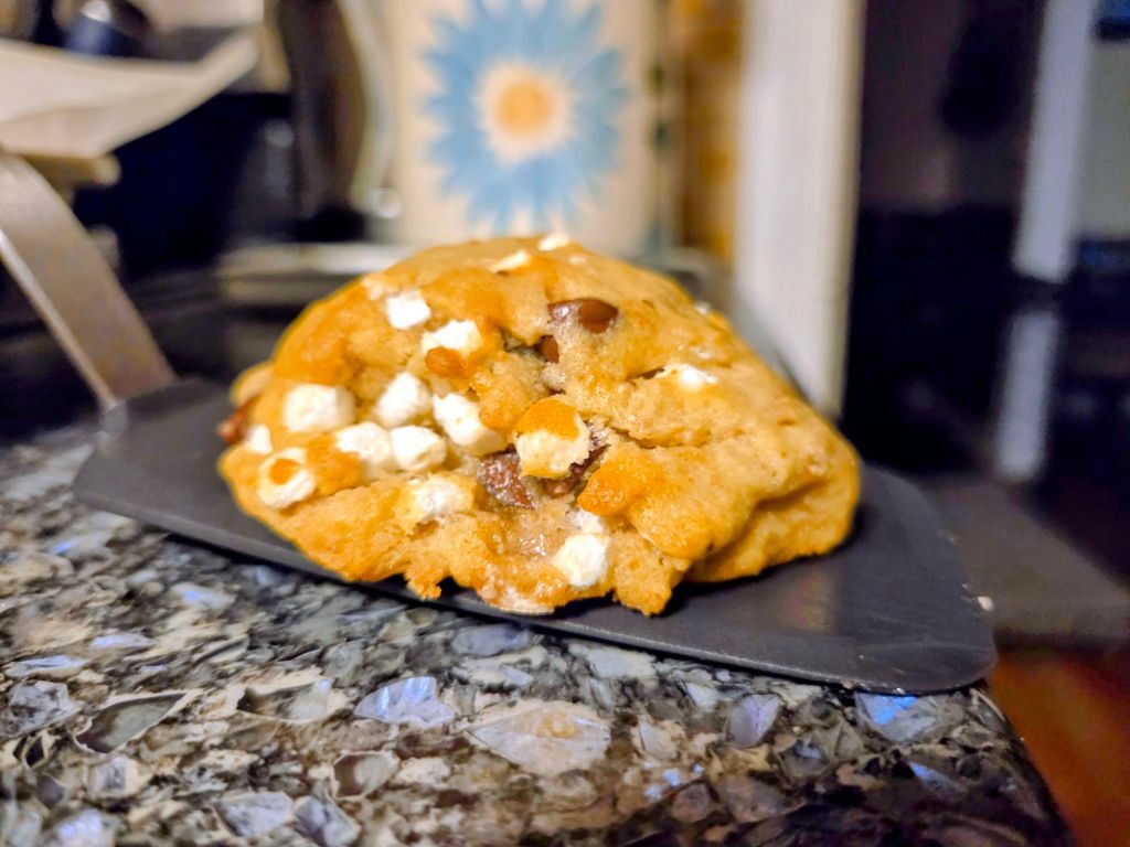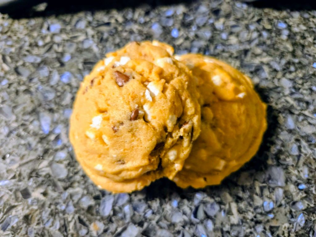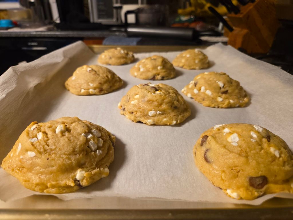 Directions – preheat oven to 350 degrees. Line a cookie sheet with parchment paper. Set aside. In a bowl, cream butter and brown sugar. Add vanilla and eggs. Blend in dry ingredients. Using your hands, mix in chips and marshmallow bits, like you would do with meatballs. Scoop out 1/4 cups dough. Stagger on prepared sheet.Bake 8 to 10 minutes, no longer (edges of bottoms will be golden brown) cool completely.
