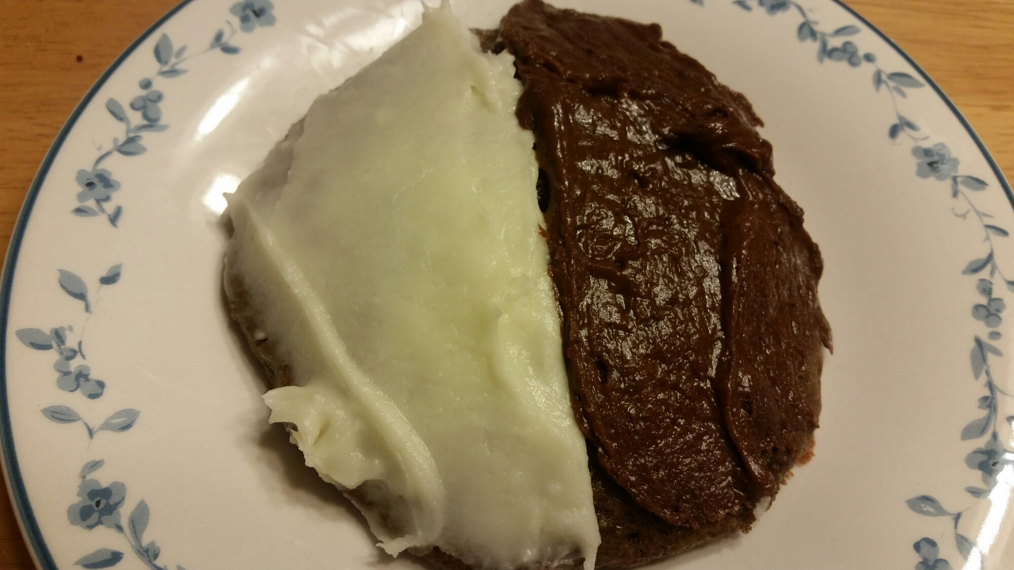 Frost half of cookie with white frosting and the other half with chocolate frosting.